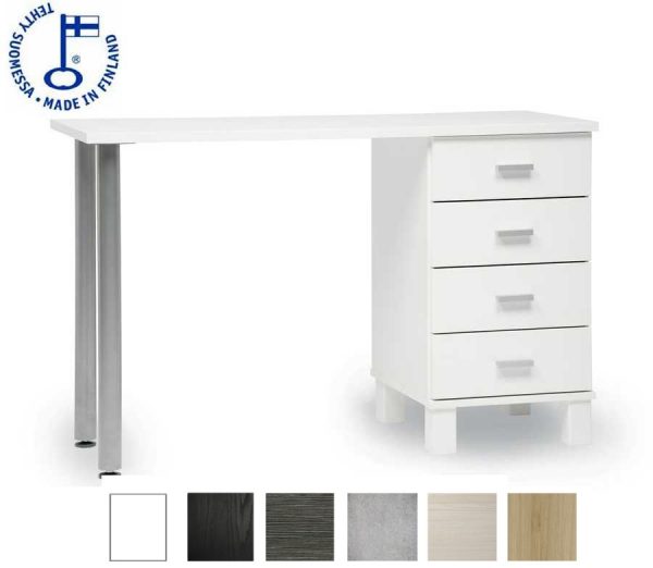 - Kotimainen korkealaatuinen Fondi-tuotesarjan kirjoituspöytä jossa vasemmalla 2 metallijalkaa ja oikealla laatikosto 4 vetolaatikkolla. Tuote toimitetaan runko koottuna ja ovi ,kansi, jalat sekä vetimet asennetaan paikoilleen.