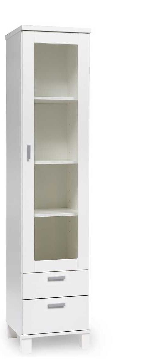 Vitriinin runko on valmistettu kestävästä valkoisesta melamiinista, ja edustat ovat valkoiseksi maalattua MDF-levyä, mikä takaa pitkäikäisyyden ja laadukkaan viimeistelyn. Kannen voit valita useista sävyistä – antrasiitti, betoni, musta, saarni, tammi tai valkoinen – ja ovi vaihtoehdoista kirkas lasi, maitolasi tai umpiovi antavat mahdollisuuden räätälöidä ulkonäkö täysin omaan tyyliisi.