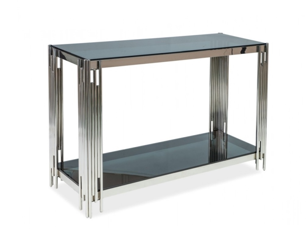 Fossil Konsolipöytä C yhdistää savunharmaan karkaistun lasikannen ja kromiset metallijalat, luoden tyylikkään, ilmavan ja ajattoman kokonaisuuden, joka sopii mihin tahansa sisustukseen.