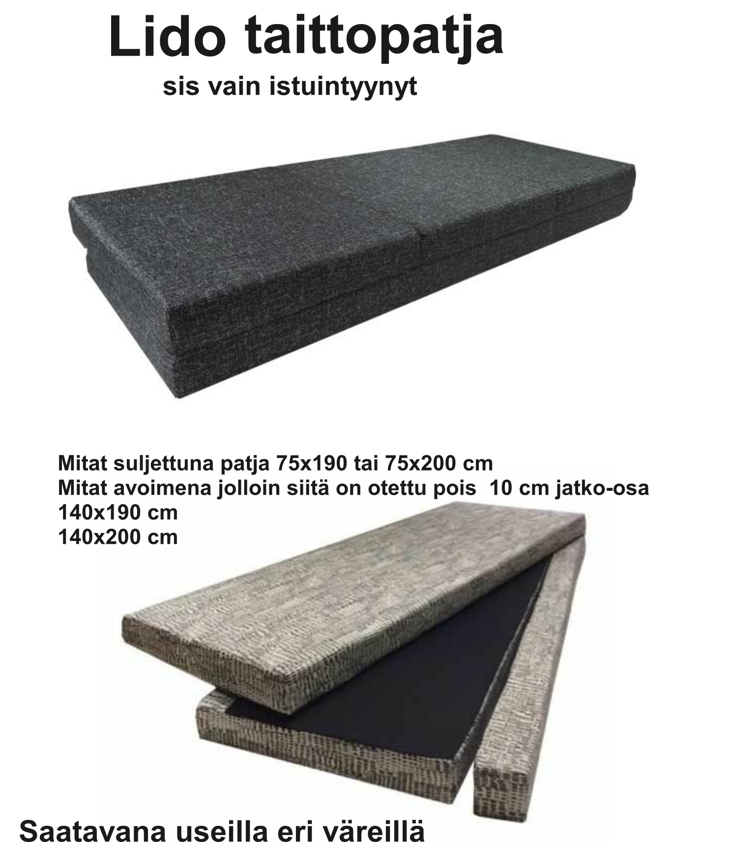 | Leveys | Syvyys | Korkeus | Halkaisija | kannen paksuus | Ruokapöydän koko avattuna 1 jatkolla | Ruokapöydän koko avattuna 2 jatkolla | Nojatuolin mitat | 2 ist sohvan mitat | 3 ist sohvan mitat | Istuinkorkeus | Työtuolin istuinkorkeus | Istuinleveys | Istuinsyvyys | Jalkojen malli | Jalkojen korkeus | Sokkelin korkeus | Selkänojan Leveys | Selkänojan korkeus | Niskatuen korkeus | Käsinojan korkeus lattaiasta | Käsinojan korkeus lattiasta | Käsinojan leveys | Käsinoja mallit | Istuintyyny | Selkätyyny | Muut pehmusteet | Divaanisohvan Jalkapäädyn korkeus | Divaanisohvan pääpäädyn korkeus | Jalkapäädyn korkeus | Pääpäädyn korkeus | Vuodesohvan syvyys avattuna | Vuodekoko | Istuinkorkeus patjan kanssa | Reunan korkeus | Sivulaidan korkeus | Patjapesän korkeus | Patjakoko | Päätyjen koot | Patjan korkeus | Patjan kovuus | Patjan koko jatkettuva | Vapaa tila sängyn alla | Sänkyjen materiaali | Patjojen materiaali | Sijauspatjan materiaali | Kangasverhoilu | Kaapin sisämitat | Laatikon sisämitat | Materiaali | Materiaalit | Mitta | Muut mitat | Muuta | lisätietoja | Väri | Jalkojen väri | Nahkavärit | Puuvärit | Vetimien väri | Vapaa tila tuotteen alla | Tekniset tiedot | Painoraja | Takuu | Saatavuus | Toimitus | Paino | Timantti värit | Jalat tai sokkeli | Kannen koko | Elementit | Ovien malli | Timantti osien materiaali | Hyllyjen materiaali | Vetimet | Valmistusmaa | Taljan mitat | Mattojen Materiaali | Tyynyjen ja torkkujen materiaali | mattojen mitat | Nukan pituus | Mattojen värit | Tyynyjen ja torkkujen värit | Rullamaton leveydet | Varjostimen korkeus: | Varjostimen leveys | Varjostimen syvyys | Valaisimen Materiaali | Valaisimen tiedot | Valaisimen värit | Varjostimen värit | Huomioitavaa | Työtuolien ominaisuudet | Työtuolien verhoilu |