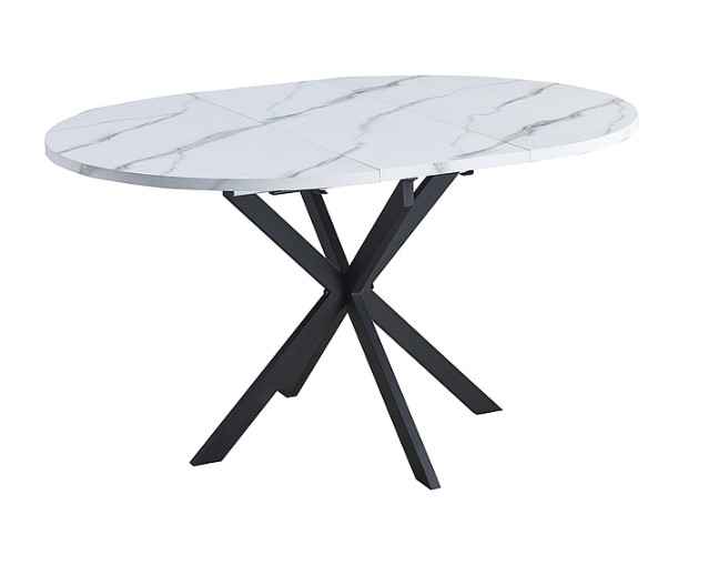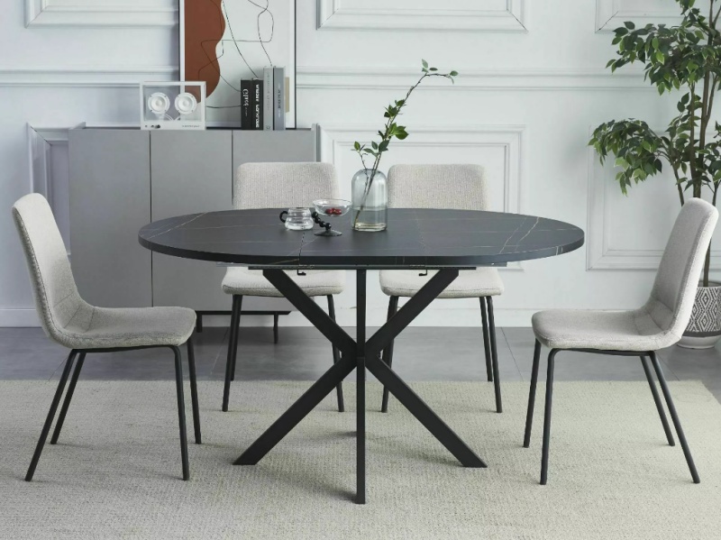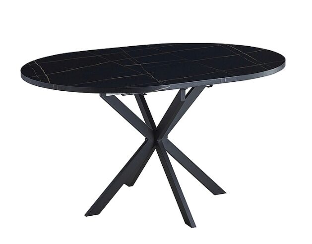 Tukeva musta metallijalka tarjoaa vakautta ja pitkäikäisyyttä, kun taas kätevä perhosjatko mahdollistaa pöydän nopean ja vaivattoman laajentamisen lisätilaa varten.