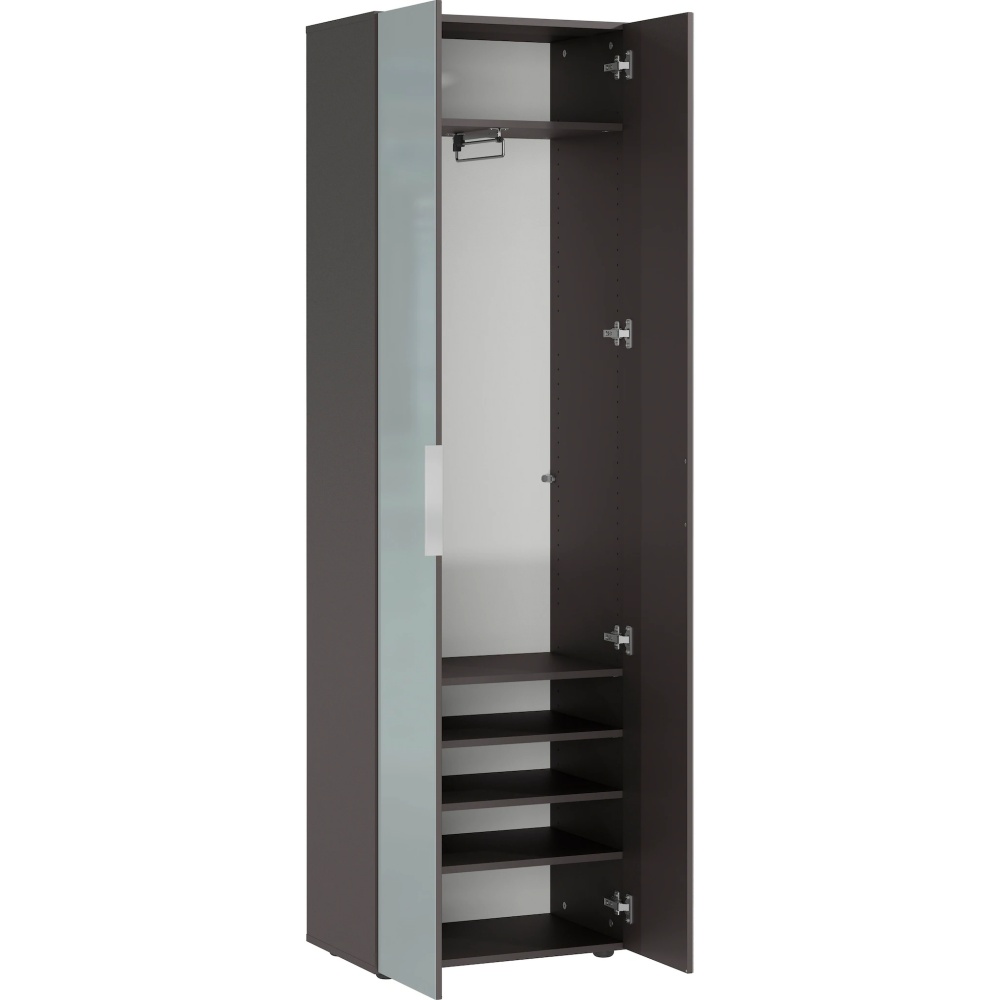 Kahden oven taakse kätkeytyy viisi korkeussäädettävää hyllyä sekä ulosvedettävä vaatenaulakko, jotka tarjoavat runsaasti muokattavaa tilaa vaatteille ja asusteille. Kaapin toiminnallisuus tekee arjen järjestyksestä helppoa ja tehokasta, oli tila sitten suuri tai pieni.