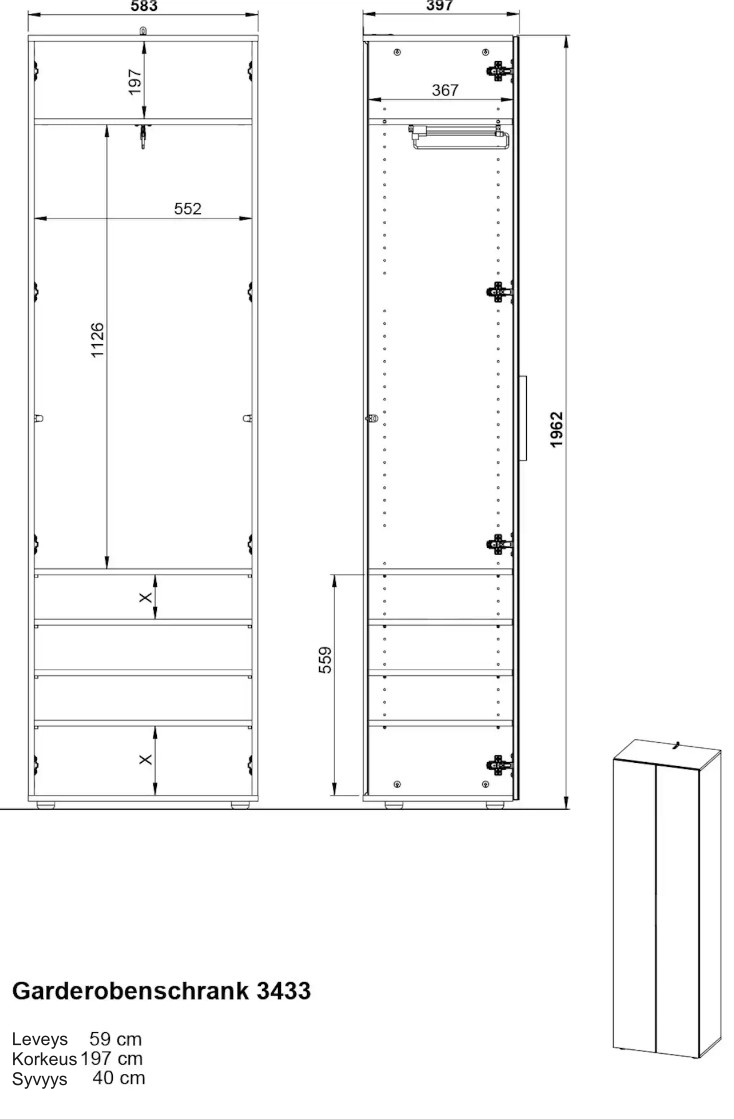 | 59 cm | 40 cm | 197 cm | cm | cm | cm | cm | cm | cm | cm | cm | cm | cm | cm | cm | cm | cm | cm | cm | cm | cm | cm | cm | cm | cm | cm | cm | cm | ABS reunat, Edusta ja kansi iskunkestävää lasia, Kalustelevy, Korkeakiiltoinen, Melamiinihartsipinoite, Ulosvedettävä vaatetanko, Vedin metallia | Grafiitti, Hopea, Valkoinen | cm | Korkeussäädettävät hyllyt, Laatikoissa itsestään sulkeutuva mekanismi, Ovissa hidastinmekanismi | Saatavana kasattuna - kasaus tilataan kassalla, Tilaustuote | Toimitus osina | 54 kg | Saksa | cm | cm | cm |