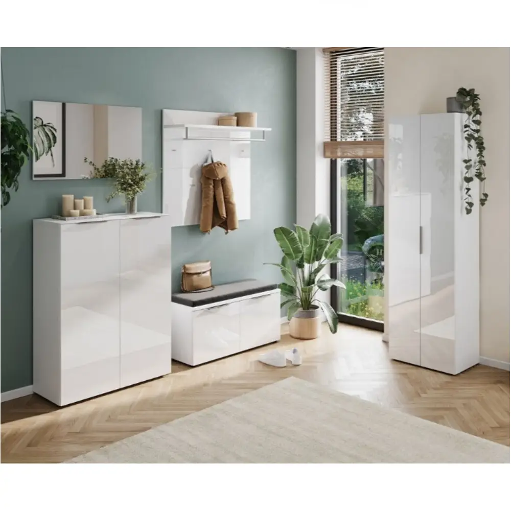 Genova vaatekaappi 3433 yhdistää harmaan lasin ja korkeakiiltoisen valkoisen näyttäväksi kokonaisuudeksi, joka tuo eteiseen tai makuuhuoneeseen modernia eleganssia. Sen selkeälinjainen muotoilu tekee siitä tyylikkään katseenvangitsijan, joka sopii saumattomasti skandinaaviseen sisustukseen.