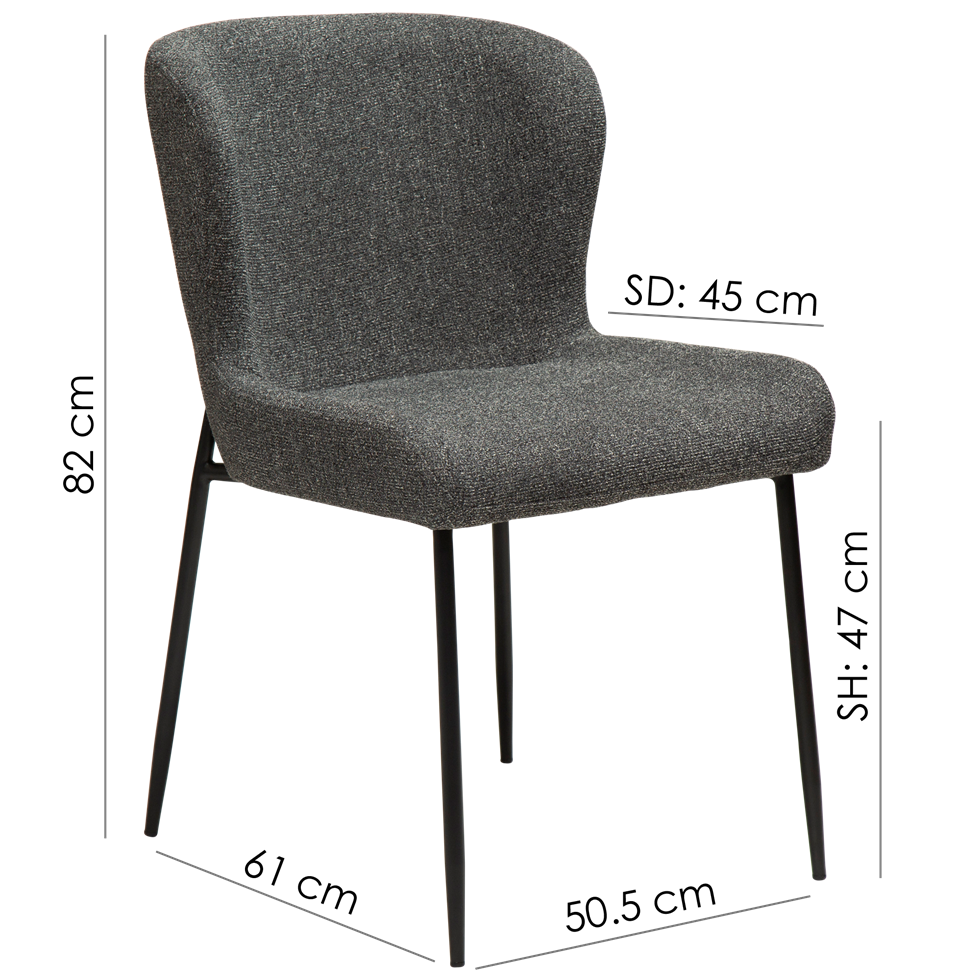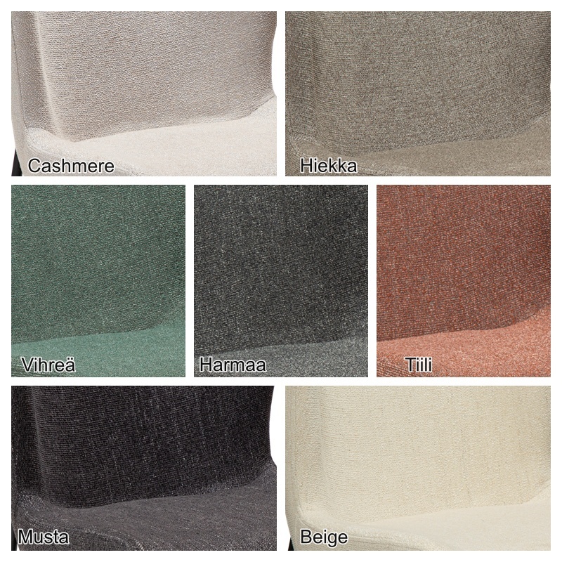 Verhoiltu miellyttävällä bouclé-kankaalla, Glam tuoli tarjoaa sekä mukavuutta että ajattoman ulkonäön. Saatavilla kauniissa sävyissä kuten beige, cashmere, harmaa, hiekka, musta, tiili ja vihreä, joten löydät helposti sisustukseesi sopivan vaihtoehdon. Pulverimaalatut mustat metallijalat tuovat tuolille erinomaisen vakauden.