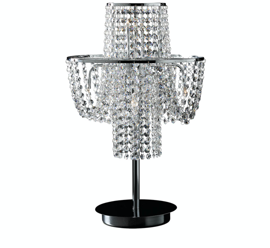Upea Glamour pöytävalaisin hurmaa kirkkailla ja korkealaatuisilla briljanttihiotuilla kristalleilla, jotka heijastavat valoa säihkyvästi ja tuovat tilaan ylellistä glamouria. Krominvärinen metallirunko viimeistelee kokonaisuuden ja tekee valaisimesta elegantin sisustuselementin olohuoneeseen, makuuhuoneeseen tai edustaville tasoille.