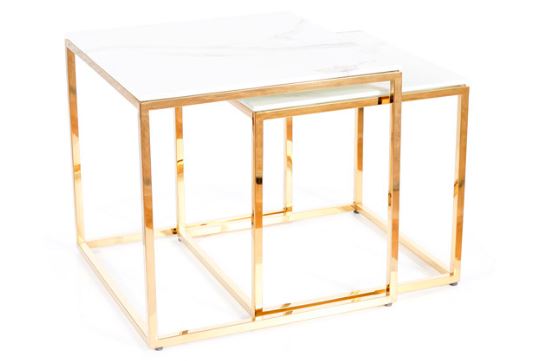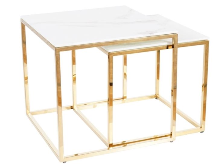 Gloria sarjapöytä yhdistää modernin kultaisen rungon ja valkoisen marmorikuvioidun karkaistun lasikannen, luoden ylellisen ja katseenvangitsevan ilmeen jokaiseen kotiin.