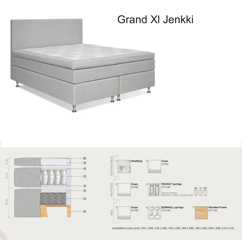 Grand XL -jenkkisänky tarjoaa ylellisen ja täysin räätälöitävän nukkumiselämyksen, jossa voit valita kaiken materiaalista kovuuteen. Sen laadukas jousitus ja tukirakenne takaavat ergonomisen tuen ja mukavuuden joka yö. Tämä sänky tekee unesta palauttavaa ja muuttaa makuuhuoneesi aidoksi rentoutumisen keitaaksi.