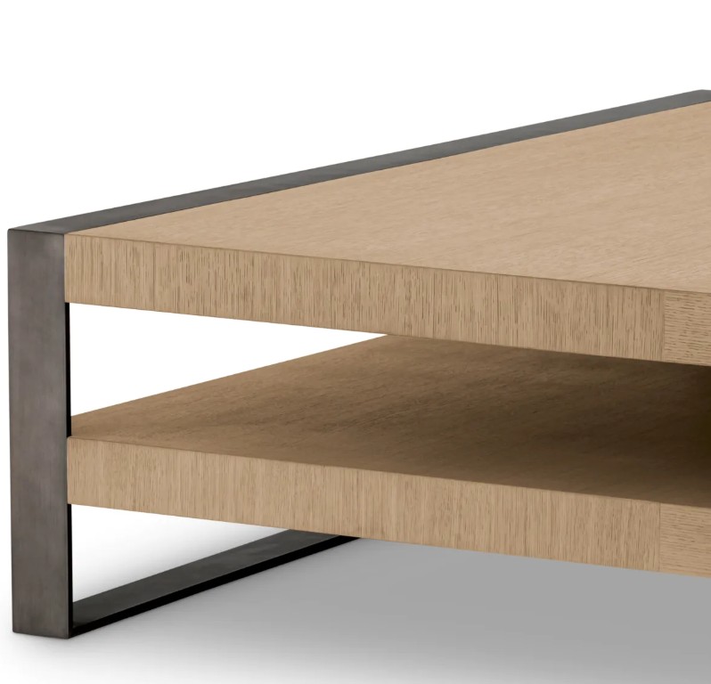 Luonnollinen tammiviilu korostaa puun kauniita syykuvioita ja tuo sisustukseen rustiikkista eleganssia. Pöydän viimeistelevä pronssinen tai messinkinen sävy luo upean kontrastin, lisäten kokonaisuuteen syvyyttä ja hienostunutta ylellisyyttä.