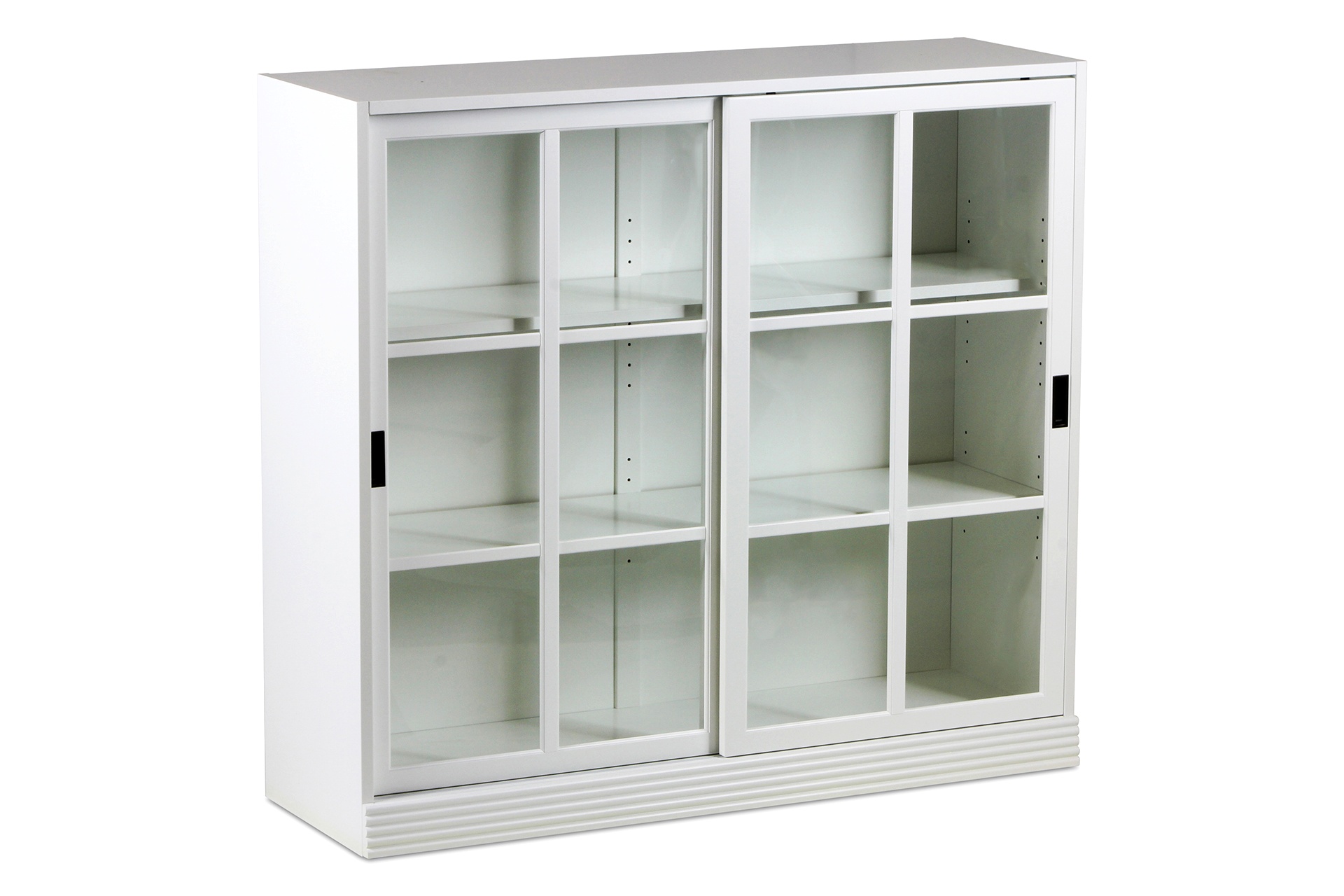 Keskellä olevat hyllyn kannakkeet tukevat levyhyllyjä erinomaisesti, joten kaappi soveltuu myös painavien esineiden säilytykseen. Valkoiseksi maalattu MDF ja karkaistu turvalasi takaavat pitkäikäisyyden ja laadukkaan kokonaisuuden.