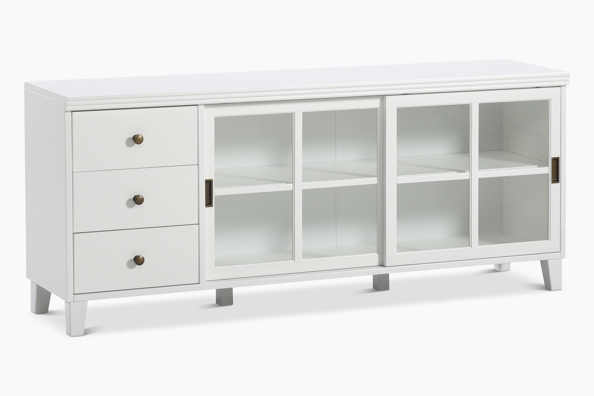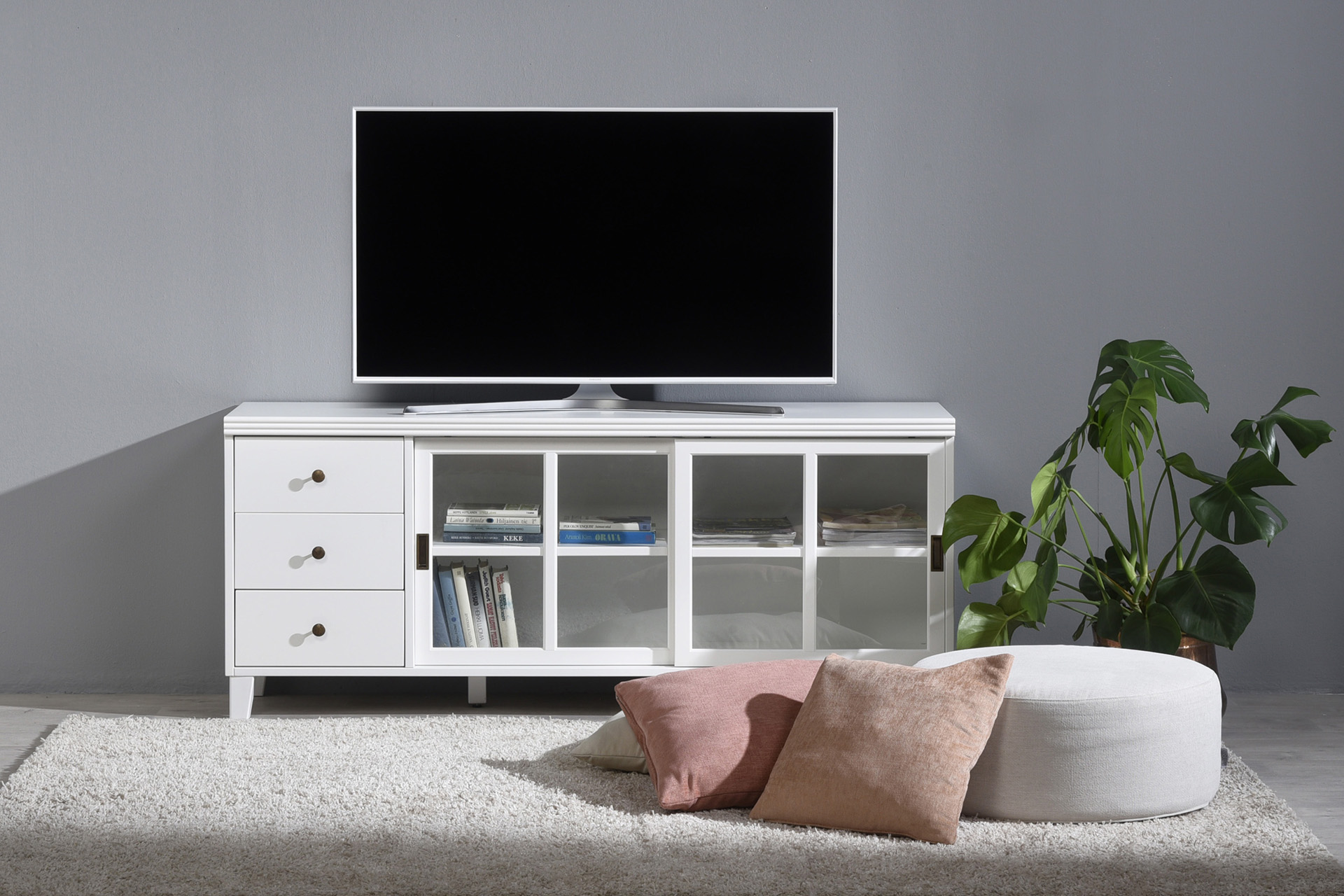 Kolme vetolaatikkoa ja kaksi liukuovellista lasikaappia tarjoavat runsaasti säilytystilaa viihdelaitteille, tarvikkeille ja sisustusesineille. Tukeva rakenne ja levyhyllyjen keskikannakkeet varmistavat, että myös painavat laitteet pysyvät turvallisesti paikoillaan.
