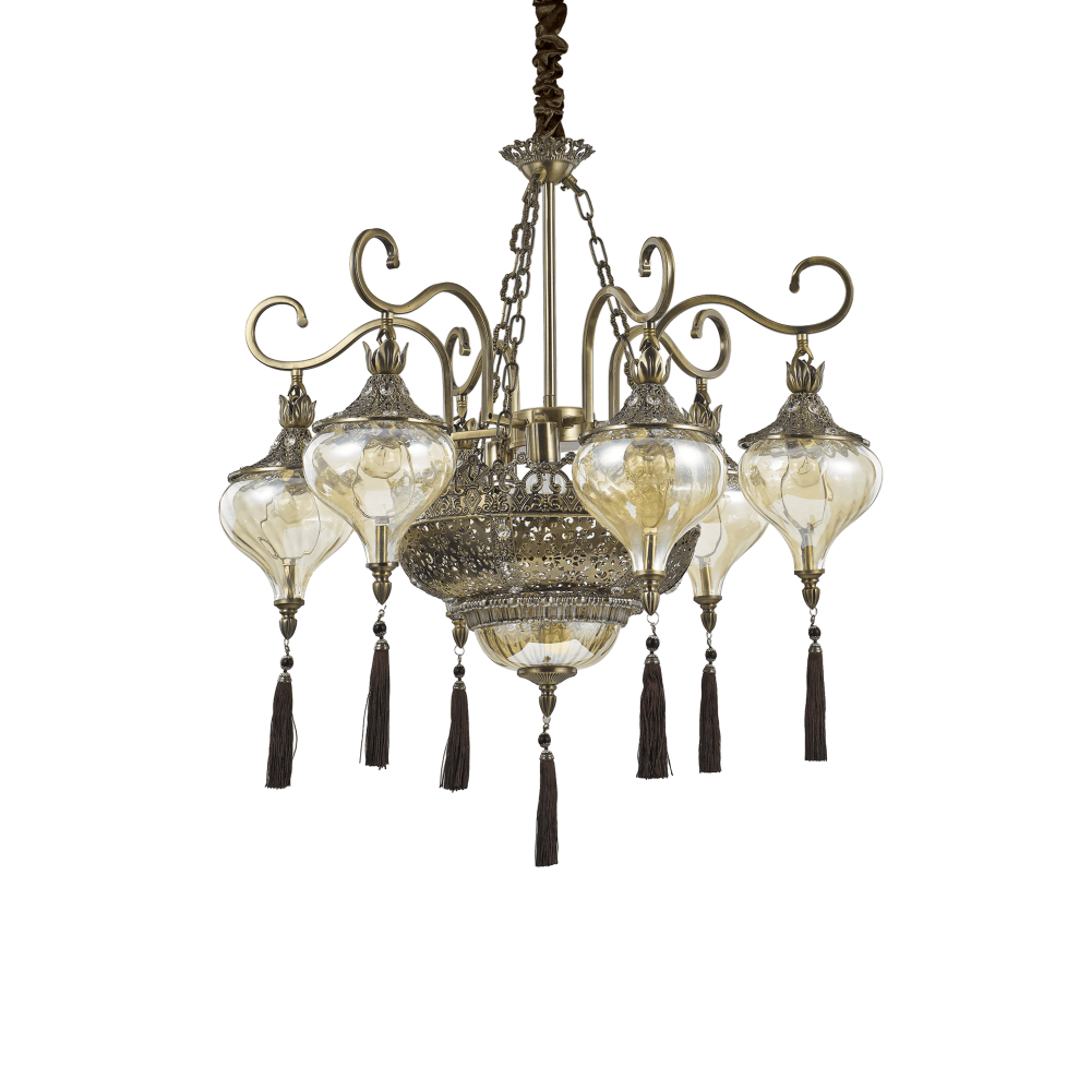 Harem SP6 kruunuvalaisin on ylellinen ja klassinen design-kruunu, jossa antiikinmessinkinen runko, kohokuvioidut yksityiskohdat ja kristallikoristeet luovat näyttävän kokonaisuuden. Säädettävä korkeus, runsas valaistus ja ajaton tyyli tekevät siitä täydellisen valinnan arvokkaaseen ja tunnelmalliseen sisävalaistukseen.