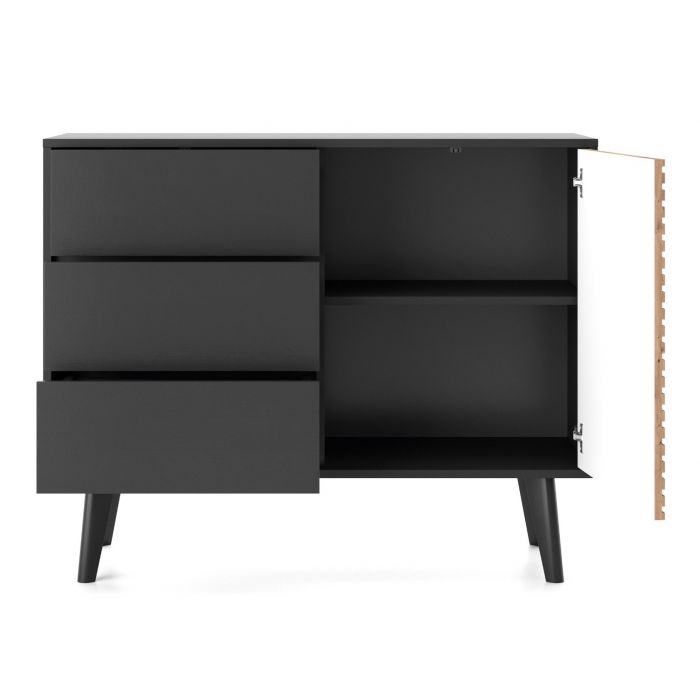 Lipastossa on kolme laatikkoa ja yksi kaappi välihyllyllä, mikä tarjoaa runsaasti monipuolista säilytystilaa kodin eri tarpeisiin. Push-to-open-mekanismi tekee laatikoiden ja oven käytöstä sulavaa ja modernia, ja 18 mm MDF-etusarjat urakuvioineen tuovat kokonaisuuteen yksilöllisen viimeistelyn.