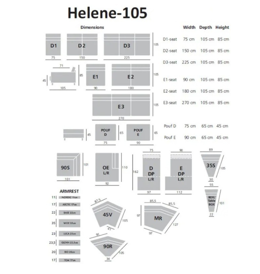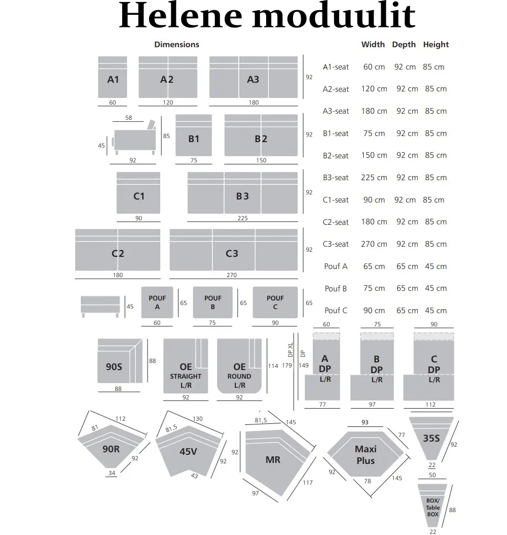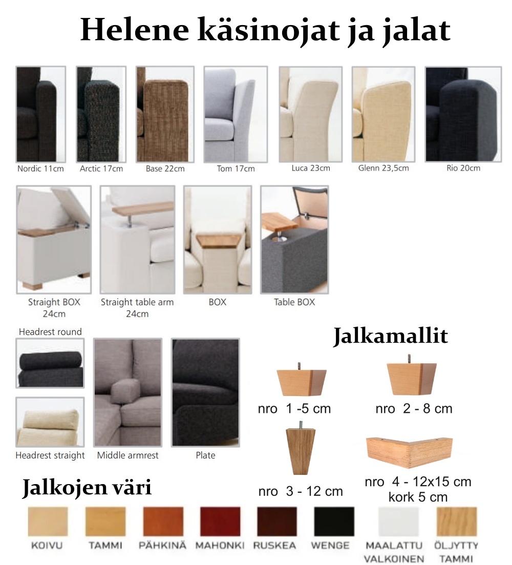 Helene sohva moduuleista on muunneltava ja ajattoman tyylikäs kokonaisuus, jonka modulaariset osat, laadukas nozag-jousitus ja HR35-pehmusteet tarjoavat miellyttävän mutta napakan istuinmukavuuden. Runsaat käsinoja-, syvyys-, jalkamalli- ja verhoiluvaihtoehdot sekä mahdollisuus valita useista nahkaväreistä tekevät siitä yksilöllisen ja pitkäikäisen sohvaratkaisun jokaiseen kotiin.