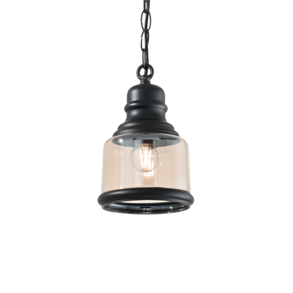 • Tyylikäs Hensel SP1 riippuvalaisin metallirungolla. Kirkas amberinvärinen lasivarjostin koristeltu mustilla reunoilla. Design Italia.
