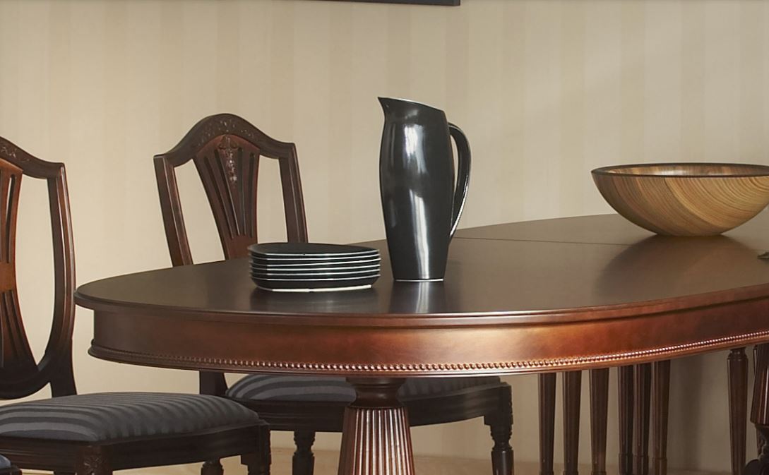 Hepplewhite-ruokailuryhmä 6 tuolilla ja kahdella jatkolla jolloin voit jatkaa pöydän koko vieraiden lisääntyessä aina 280 cm pitkäksi ruokapöydäksi. Tuttavallisemmin harppuempire, on elegantti empiretyylinen ruokailuryhmä, jossa tuoleissa kilvenmuotoinen selkänoja ja lyhdeselusta henkivät hienostunutta klassismia. Tyylisuunta on saanut nimensä englantilaiselta mestaripuusepältä George Hepplewhitelta, jonka luomukset ovat vaikuttaneet huonekalumuotoiluun sukupolvesta toiseen.