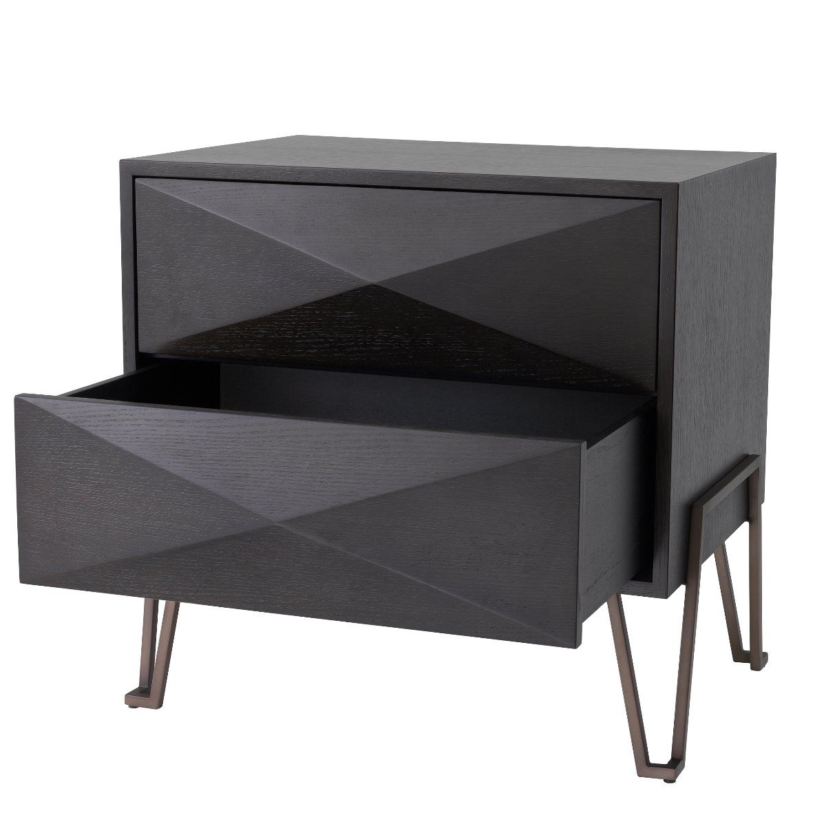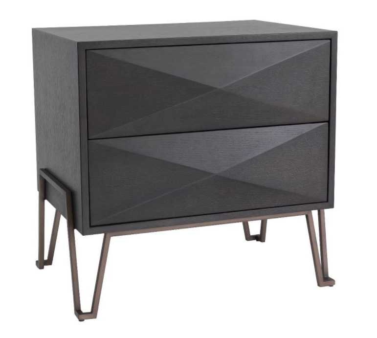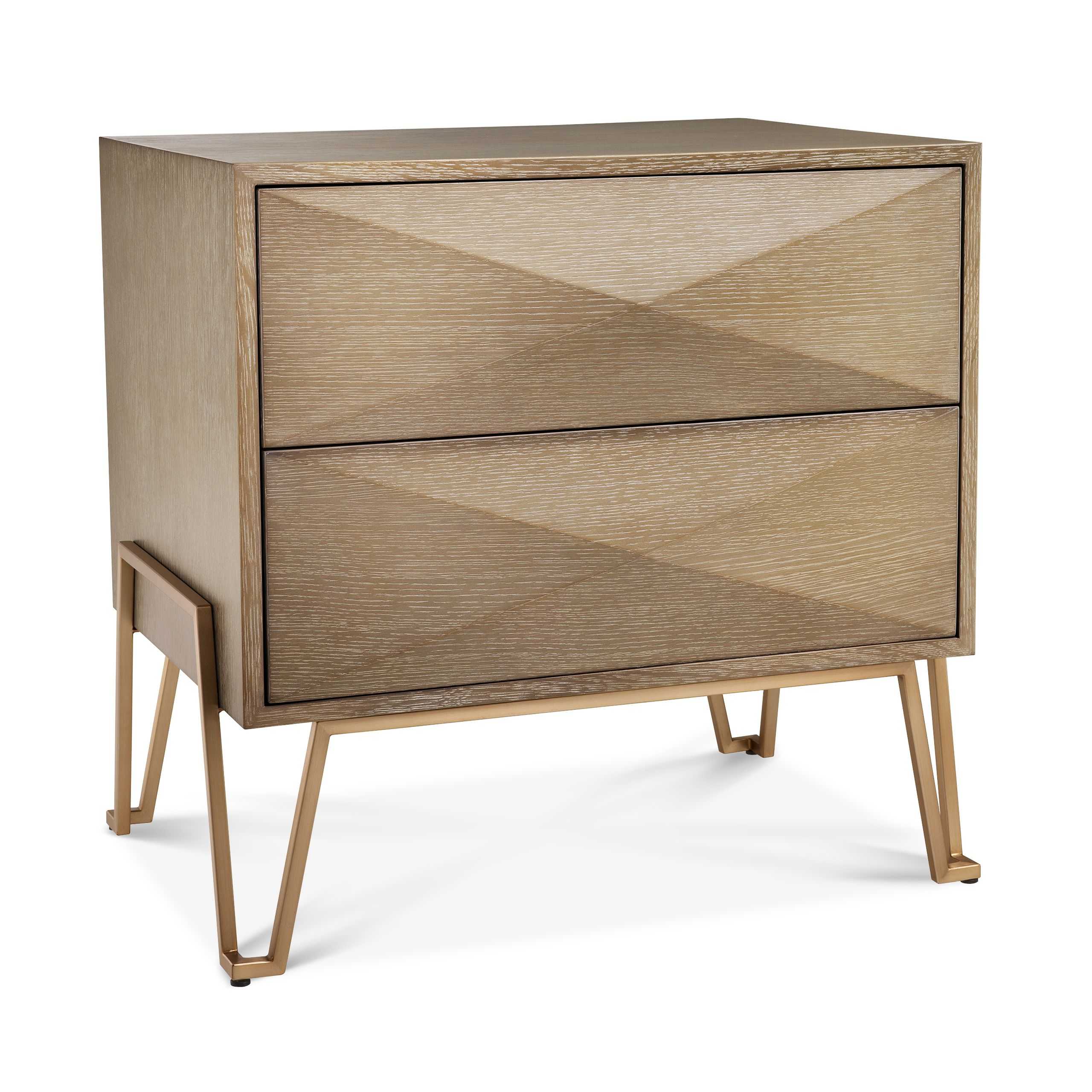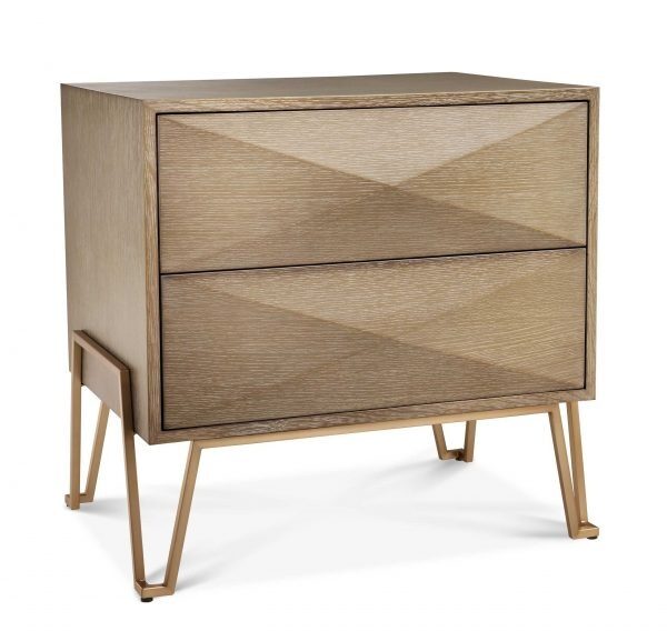 Highland yöpöytä yhdistää luonnollisen tammiviilun ja harjatun messingin, luoden ylellisen ja modernin ilmeen makuuhuoneeseesi. Kolmionmuotoiset ovet tuovat design-henkisen yksityiskohdan, joka tekee yöpöydästä todellisen katseenvangitsijan.