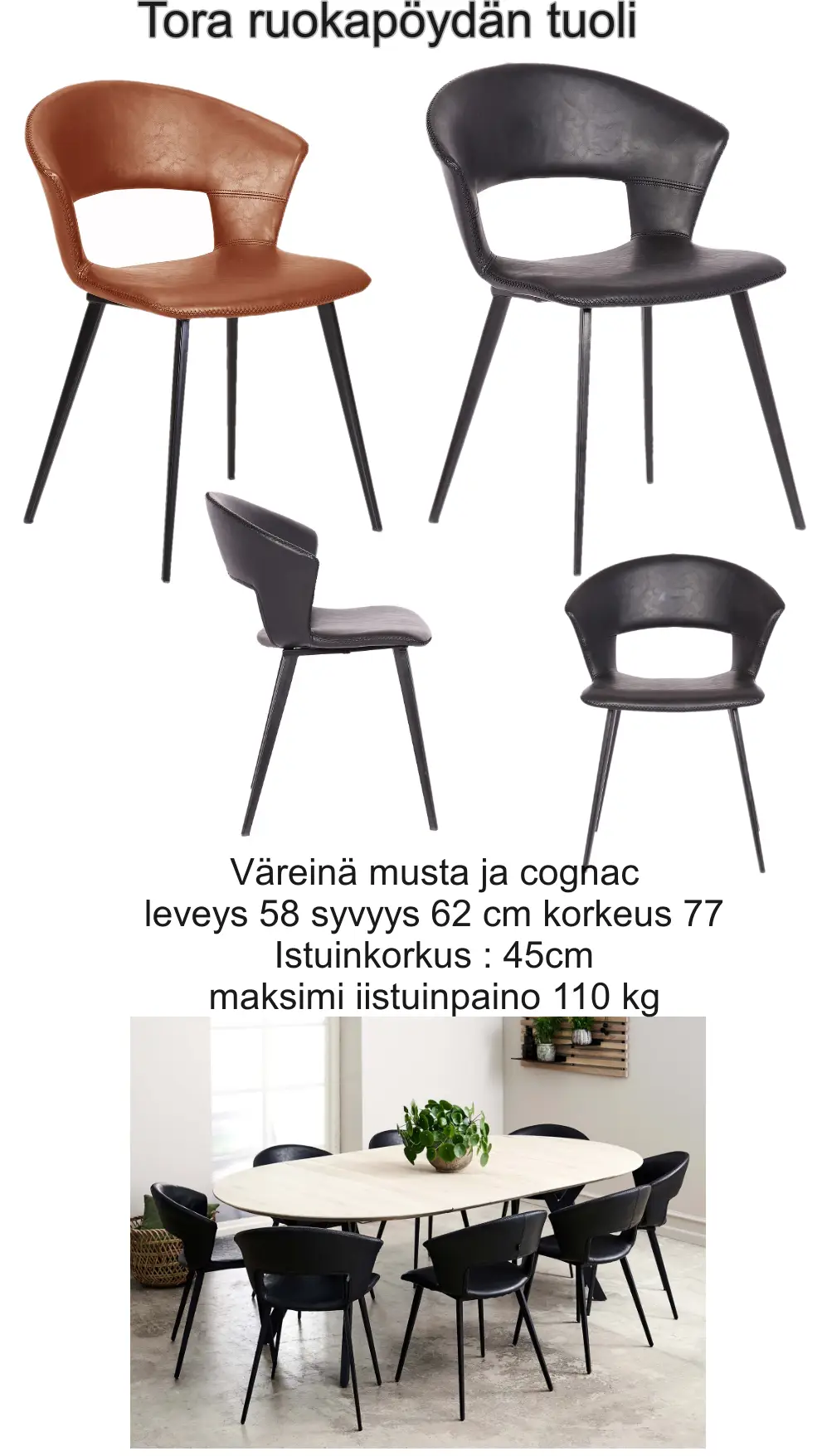 Massiivipuu elää luonnollisesti lämpö- ja kosteusvaihteluiden mukana, mikä on täysin normaalia ja kertoo aidosta materiaalista; mahdolliset halkeamat voidaan tarvittaessa täyttää puukitillä. Hoitoa helpottaa erikseen saatava hoitoöljy, ja kokonaisuuden voi viimeistellä lisähinnasta yhteensopivilla Tora-ruokapöydän tuoleilla.
