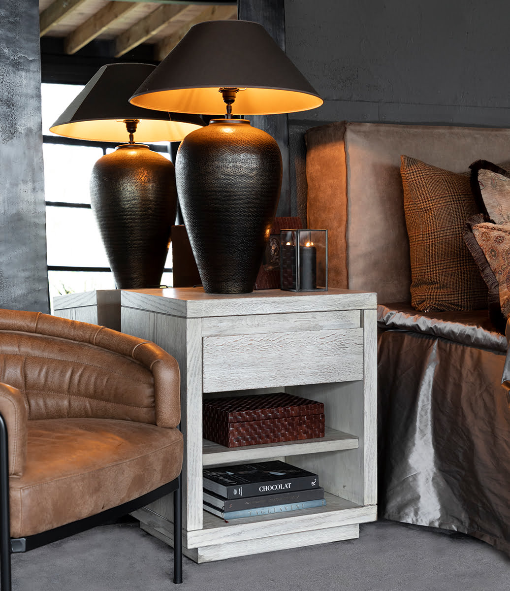 Hunter-yöpöytä sulautuu saumattomasti sekä moderniin että perinteiseen sisustukseen, tuoden makuuhuoneeseen harmonista ja viimeisteltyä ilmettä.