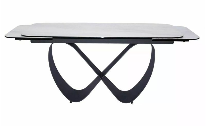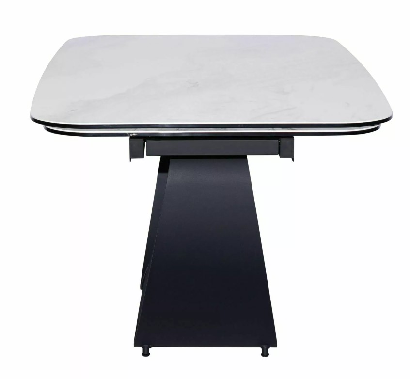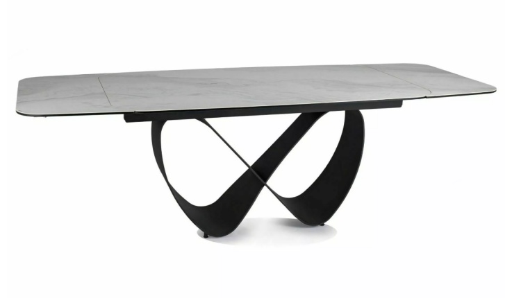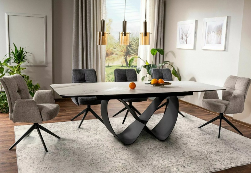 Infinity ruokapöytä yhdistää tyylikkään mustan jalan ja valkoisen marmorikuvioidun pinnan, jossa harmaat juonteet tuovat kokonaisuuteen rauhallista eleganssia. Sen moderni ilme tekee pöydästä näyttävän valinnan mihin tahansa sisustukseen ja nostaa tilan visuaalista ilmettä.