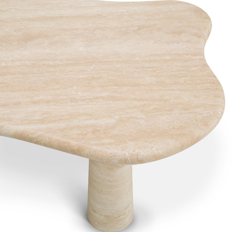 Laadukkaasta travertiinista valmistettu pöytä hurmaa luonnollisilla sävyillään ja elävällä pinnallaan. Jokainen kappale on yksilöllinen, ja sen muotoiltu kansi sekä jykevät sylinterimäiset jalat korostavat materiaalin autenttista tekstuuria ja ajattomuutta.