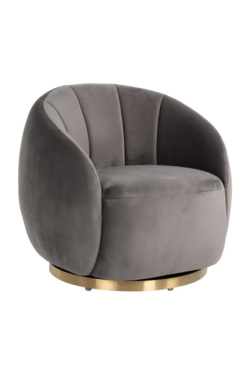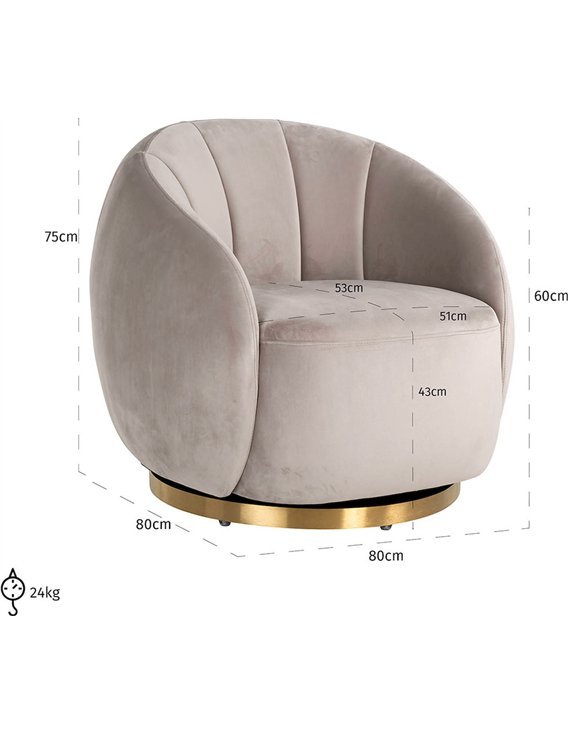 Jago pyörivä nojatuoli hurmaa pehmeillä kaarevilla linjoillaan ja harmaalla samettiverhoilullaan, jotka tuovat sisustukseen ajattomuutta ja modernia eleganssia. Sen ylellinen messinkijalka lisää näyttävyyttä ja tekee nojatuolista huoneen huomion keskipisteen.