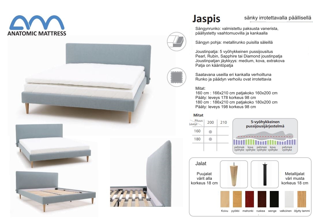 Jaspis-sänky 180×200 cm yhdistää tyylin, mukavuuden ja laadun upeaksi kokonaisuudeksi. Irrotettava ja pestävä kangasverhoilu useissa sävyissä sekä valittavat puu- tai metallijalat tekevät siitä helposti muokattavan omaan sisustukseen. Massiivipuurunko ja yhteensopivat Pearl-joustinpatjat tai vaahtomuovisijauspatja takaavat ylellisen ja kestävän nukkumiskokemuksen vuosiksi eteenpäin.