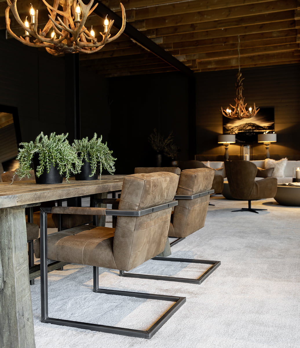 Kestävästä metalliputkesta valmistettu runko ja aito ruskea nupukkinahkaverhoilu tuovat tuoliin ylellisyyttä, kun taas vanerista valmistettu selkänoja ja istuin kylmävaahtopehmusteella tarjoavat optimaalista ergonomiaa.