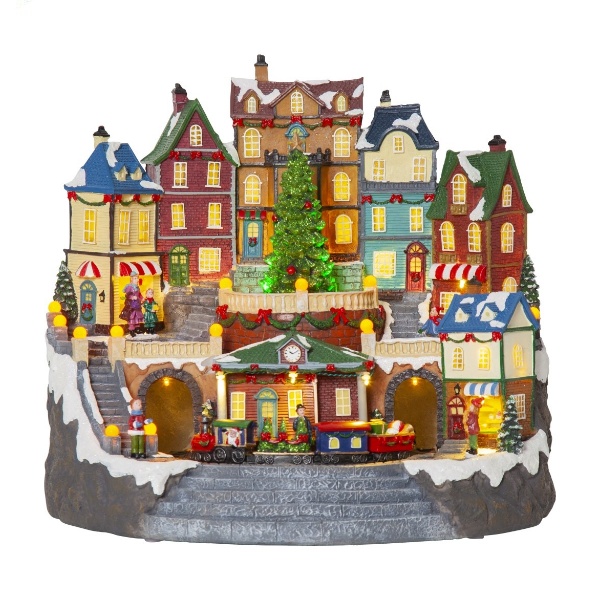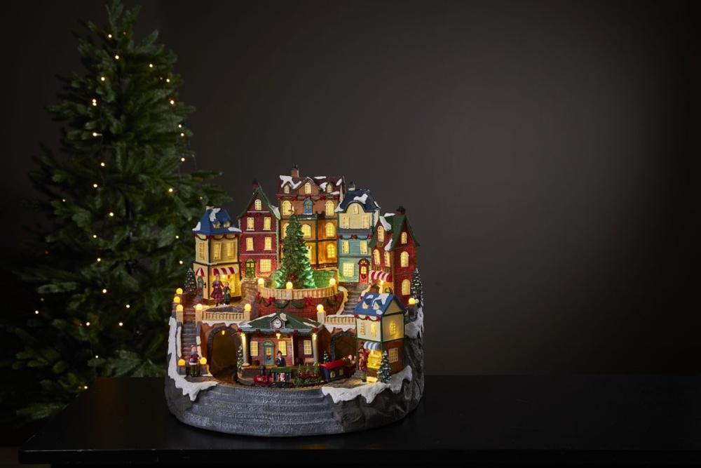 Hieno jouluinen kaupunki, jossa upeita erilaisia yksityiskohtia. Kaupungin keskellä oleva joulukuusi pyörii ja koriste soittaa 8 eri joululaulua. Musiikin saa myös kytkettyä pois päältä. Valojen sävyt ovat lämpimän valkoisia ja värivaloja. Koriste on tarkoitettu sisäkäyttöön.