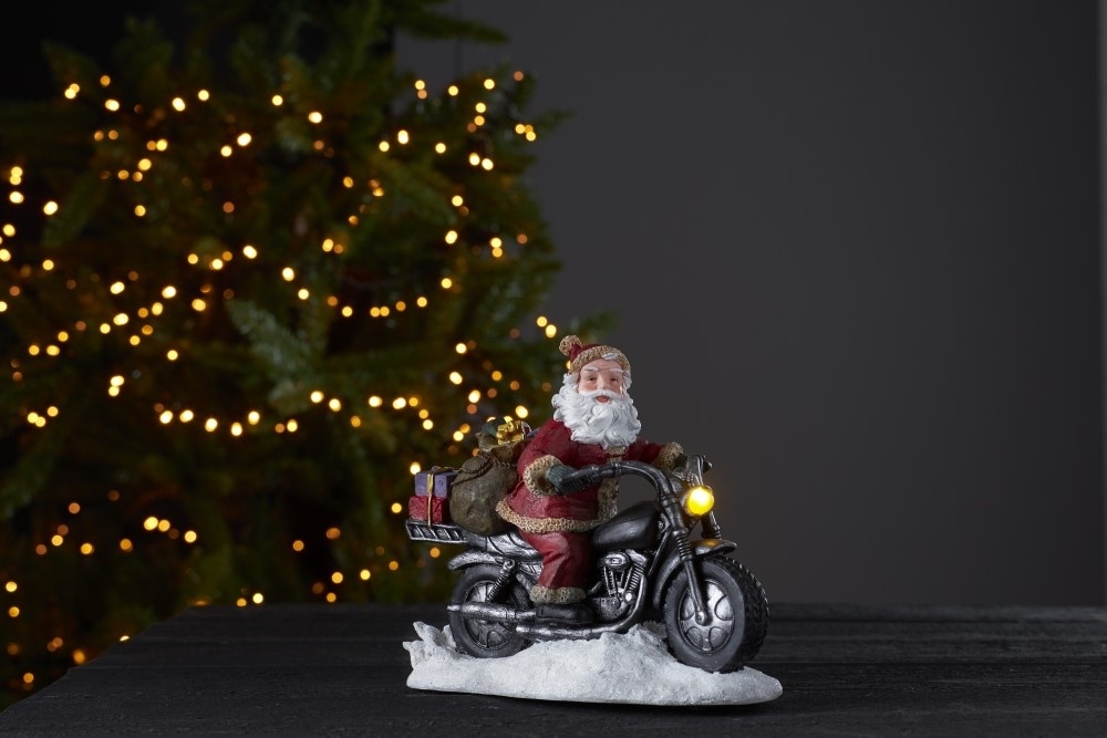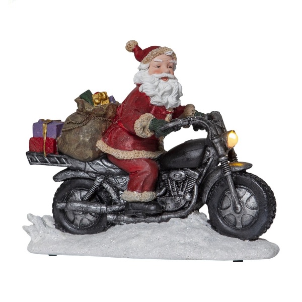 Hieno joulupukki ja moottoripyörä pöytäkoriste, jossa upeita yksityiskohtia. Koristeessa on keltaiset valot ja toistuva ajastin, joka on 6h päällä ja 18h pois päältä. Koriste on tarkoitettu sisäkäyttöön.