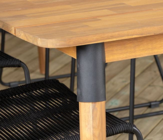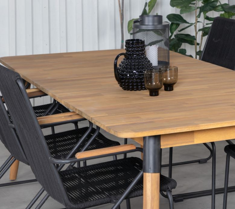 Julian, suorakaiteen muotoinen tyylikäs ruokapöytä, jossa on tilaa monelle. Pöytä on valmistettu ruskeasta akaasiasta ja siinä on tyylikkäät mustat yksityiskohdat jotka antavat pöydälle mukavan ylellisyyden. Kutsu perhe ja ystävät upealle ulkoillalliselle tulevana kesänä! Jotta puiset ulkokalusteet säilyttäisivät viimeistelynsä, ne tulee olla öljykäsitelty.