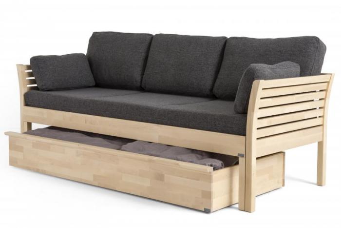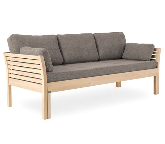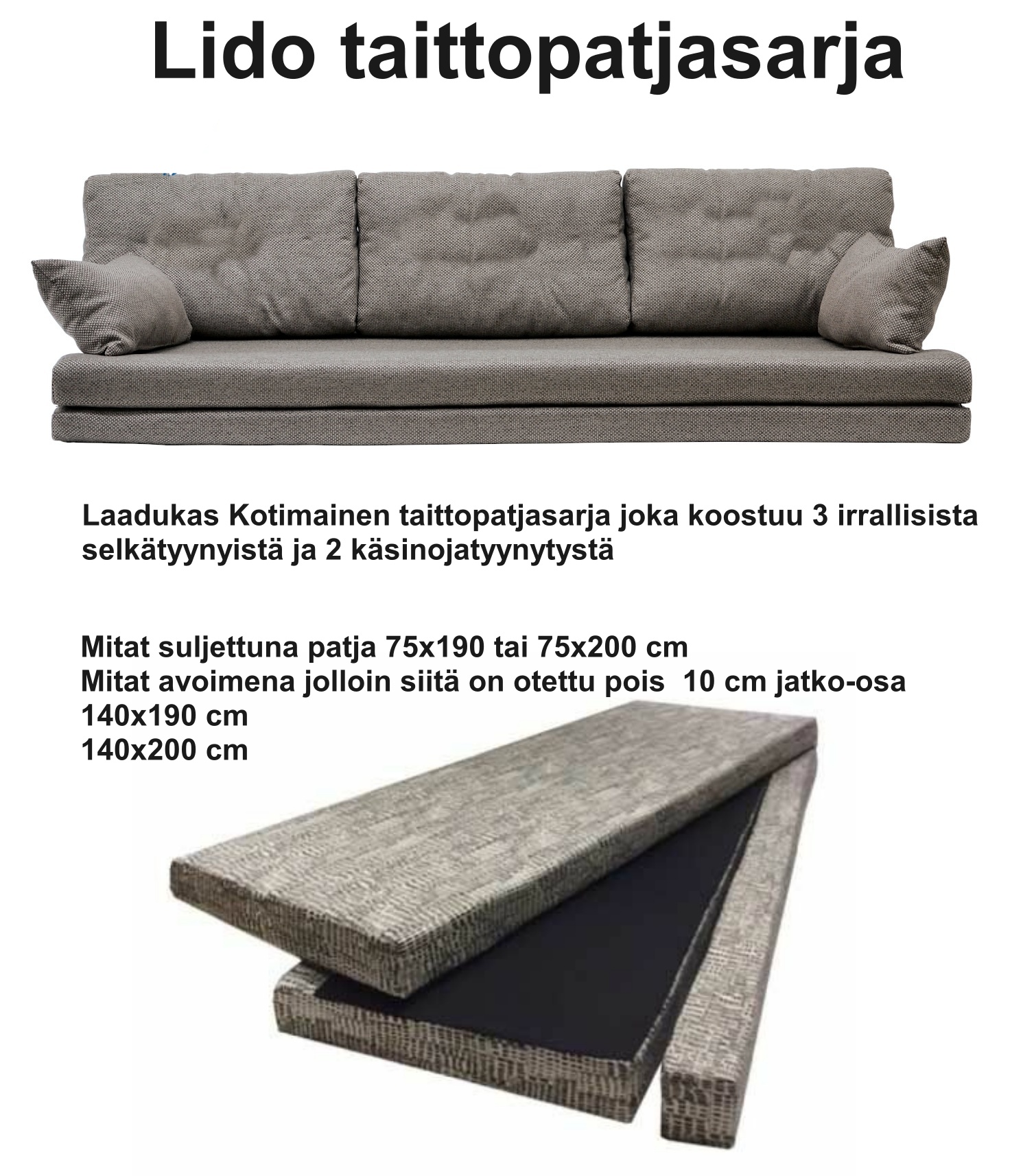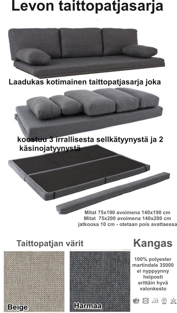 Käytännöllinen puusohva muuntuu käteväksi vuoteeksi vieraille ja voit valita koon 2 eri vaihtoehdosta. Vuodesohvaan on valittavana 2 eri taittopatjasarja vaihtoehtoa jossa on kolme isoa pehmeää selkänojatyynyä sekä kaksi pienempää käsinojatyynyä. Toinen malli on Lido taittopatjasarja jossa värejä on enemmän mutta se valmistetaan tilauksesta kun taas Levon taittopatjasarja on varastotuote. Patjan saa aukaistua ja levitettyä vuodepatjaksi. Vaahtomuovinen patja on verhoiltu kulutusta kestävällä kankaalla, joka takaa pitkäikäisyyden.