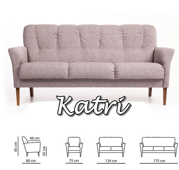 Katri sohvakalustoon kuuluu nojatuoli sekä 2 ja 3 ist sohvat. Valitse haluamasi määrä erikokoisia sohvia ja luo juuri sinun tarpeisiisi sopiva kokoonpano. omaa kauniin retron muotoilun, joka sopii moniin eri sisustuksiin. Pienen tilan Katri sohva tarjoaa sekä mukavuutta että käytännöllisyyttä. Runko on laadukasta massiivipuuta, kalustelevyä sekä vaneria, ja istuimissa on laadukas zig-zag jousitus ja selkänojassa kumivyöjousitus. Sohvan tausta on myös viimeistelty, joten sijoitus huoneen keskelle on myös mahdollista. Katri sohvan etujalat on hieman takajalkoja korkeammat. Viimeistele kokonaisuus tilaamalla tyylikkäät koristetyynyt.
