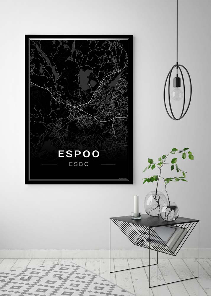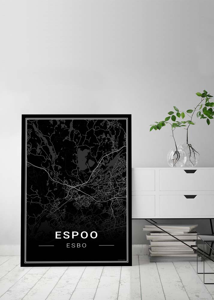 Espoo kaupunkijuliste valmistetaan Suomessa ja painetaan laadukkaalle 140-grammaiselle mattapintaiselle paperille. Juliste toimitetaan ilman kehyksiä postitusputkessa. Mikäli et löydä etsimääsi kaupunkia tai haluat julisteen eri tekstillä, voit tilata kustomoidun julisteen mistä tahansa Suomen kaupungista, kunnasta tai kylästä asiakaspalvelun kautta.