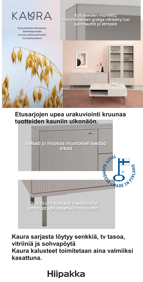 Tämä kaluste toimitetaan valmiiksi koottuna – vain jalat tarvitsee kiinnittää. Kaura-tv-taso tai senkki sopii täydellisesti yhteen muiden Kaura-sarjan tuotteiden, kuten vitriinin ja sohvapöydän, kanssa muodostaen harmonisen ja modernin kokonaisuuden kotiin. Tutustu muihin kaura tuotteisiin