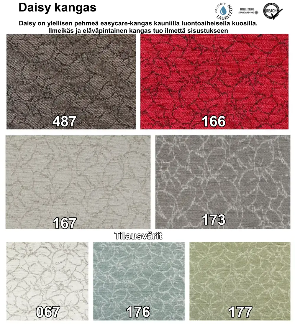 Voit valita Lauritzonin Daisy tai Manhattan verhoilukankaista mieleisesi värin. Lauritzonin easycare-kankaat ovat kestäviä, luonnostaan vesipestäviä ja helppohoitoisia, eikä niihin ole lisätty kemikaaleja. Lisäksi pehmuste on saatavilla useilla muilla kankailla, jolloin asiakaspalvelumme auttaa mielellään täydellisen vaihtoehdon löytämisessä juuri sinun tarpeisiisi.