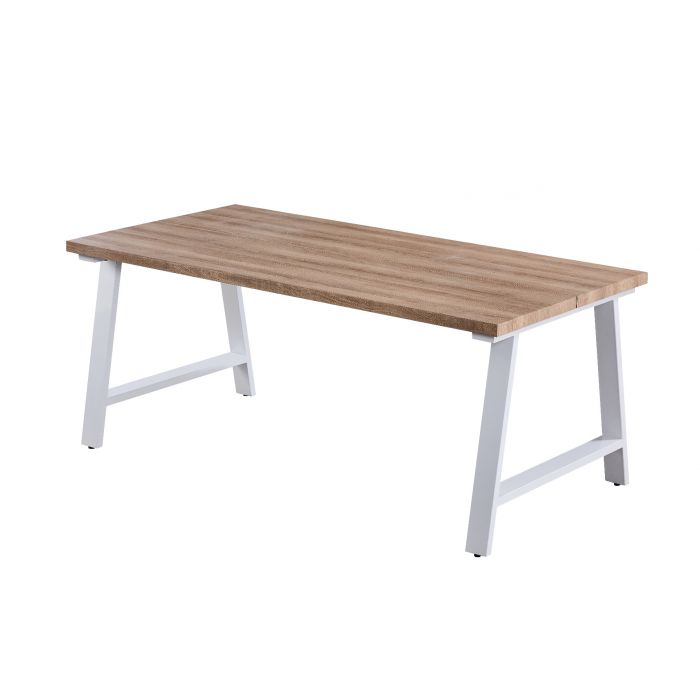 Metallijalat takaavat tukevan rakenteen, joka kestää päivittäistä käyttöä, ja pinnoitettu MDF-kansi säilyttää ulkonäkönsä kauniina pitkään. Pöytä toimitetaan osina, mikä tekee kuljettamisesta ja kokoamisesta vaivatonta.