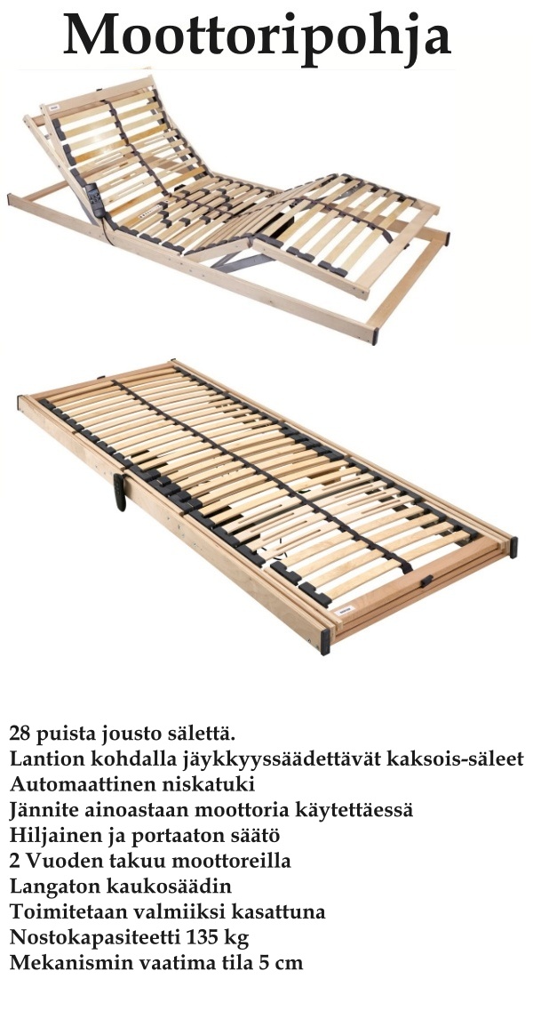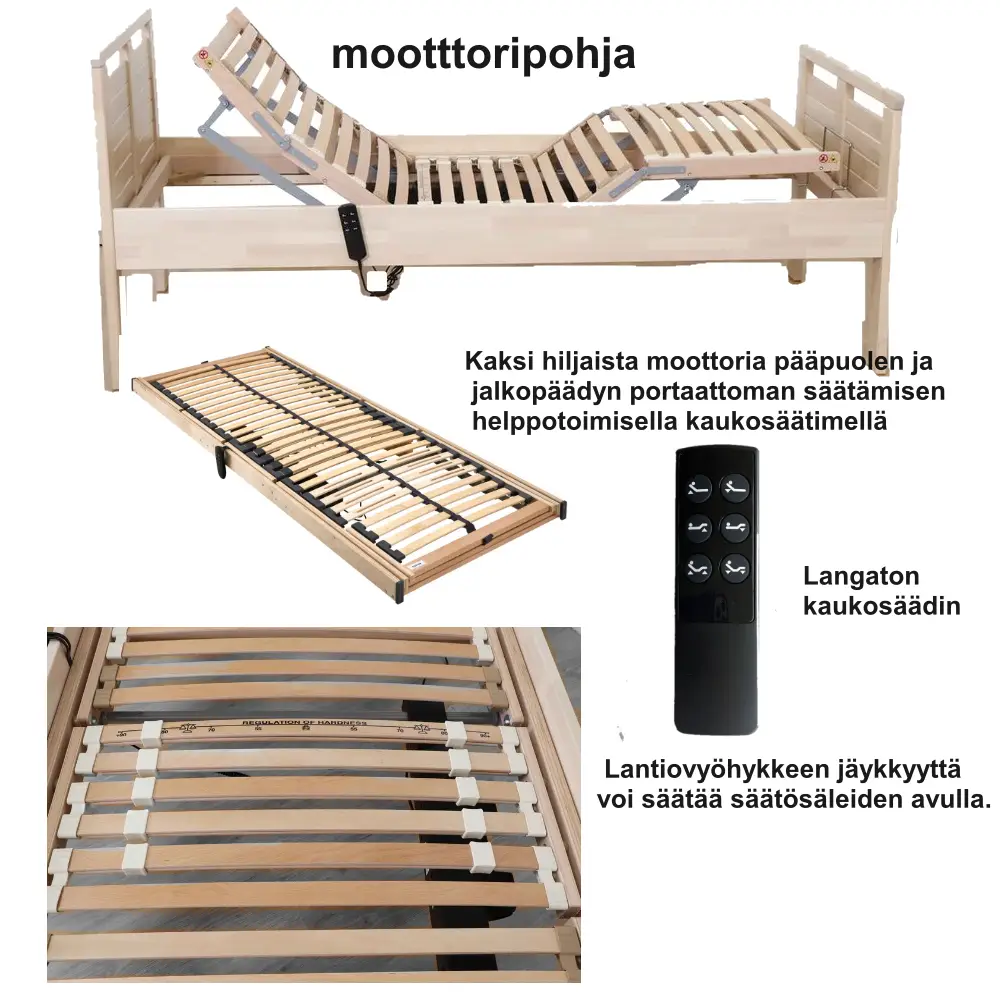 Alkuperäinen senioreille suunniteltu massiivikoivusta valmistettu sänky. Moottoroidussa säätöpohjassa on joustosäleet jotka ovat todella pitkäikäisiä. Lantion kohdalla on mahdollisuus säätää säleiden jäykkyyttä. Säätöpohja toimii langattomalla kaukosäätimellä josta voit säätää jalka tai pääpäädyn korkeuden haluamaasi asentoon portaattomasti, säätöpohjassa on automaattinen niskatuensäätö pääpäätyä säätäessä.