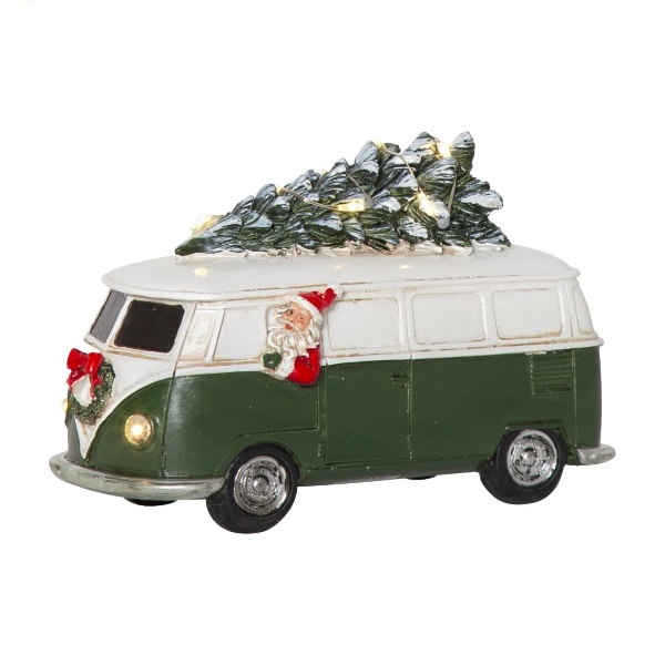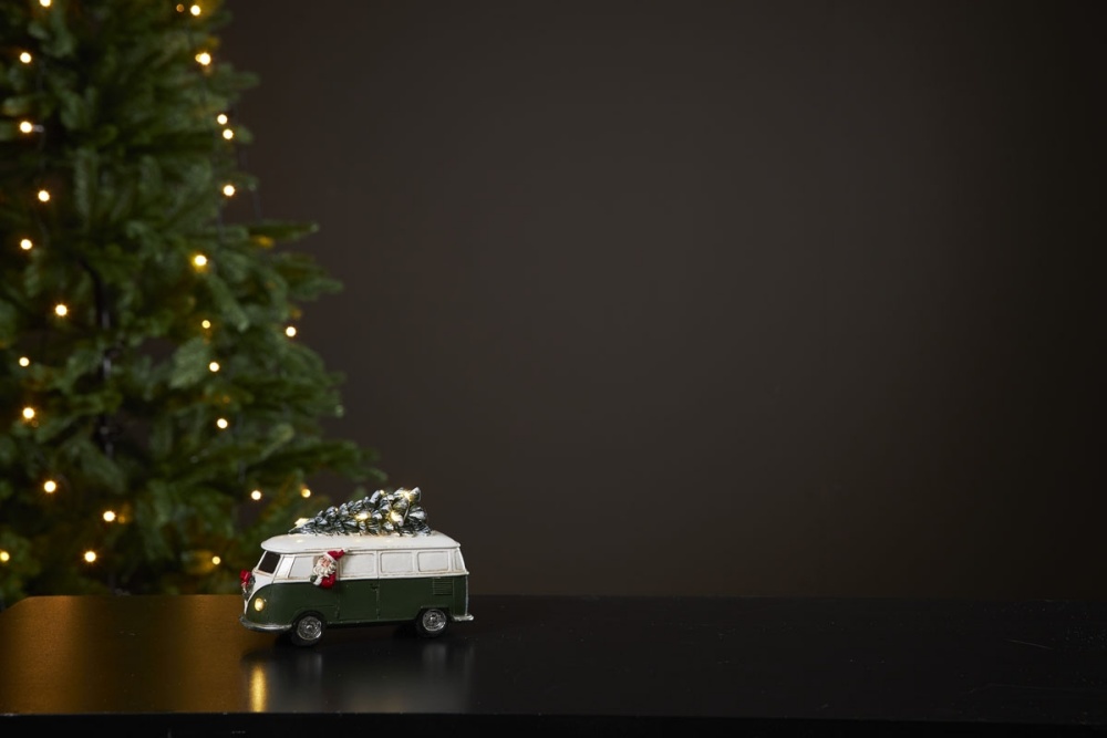Hieno joulupukki ja Kleinbuss pöytäkoriste, jossa upeita yksityiskohtia, kuten joulukuusi katolla. Koristeessa on lämpimän valkoisen sävyiset valot ja toistuva ajastin, joka on 6h päällä ja 18h pois päältä. Koriste on tarkoitettu sisäkäyttöön.