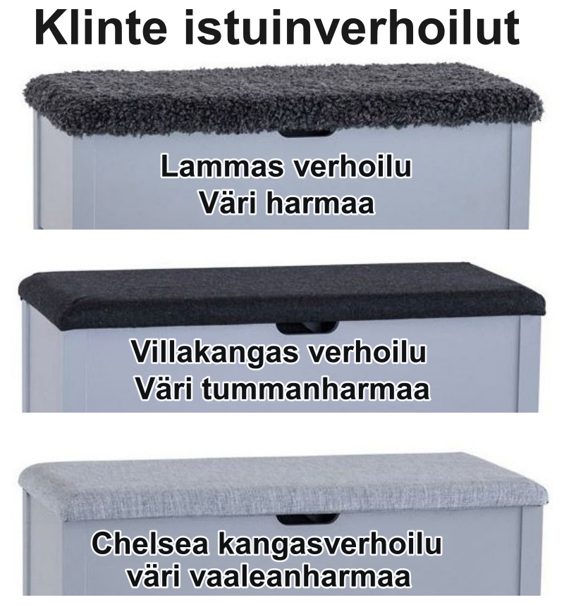 Klinte eteispenkin runko on valmistettu massiivipuusta ja MDF-levystä, mikä takaa tukevuuden ja kestävyyden. Musta runko yhdistyy kauniisti vaaleanharmaaseen kangasverhoiluun, harmaaseen villakankaaseen tai harmaaseen keinolammasverhoiluun. Penkki toimitetaan valmiiksi koottuna ja on heti käyttövalmis. Kompaktit mitat 47 × 42 × 46 cm tekevät siitä erinomaisen myös pienempiin eteistiloihin.