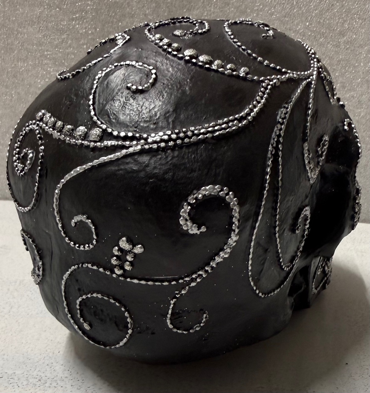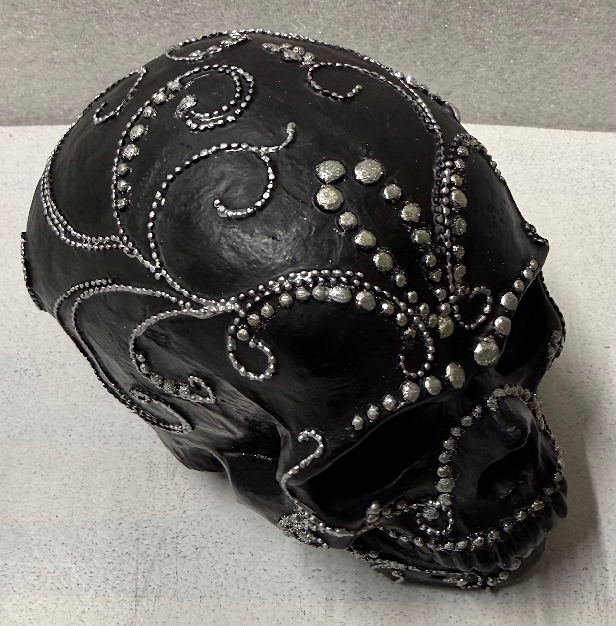 Koristepääkallo – Musta yhdistää rohkean mustan värin, hopeisen ylellisyyden ja monikäyttöisen muotoilun, luoden modernin ja näyttävän lisän mihin tahansa sisustukseen.