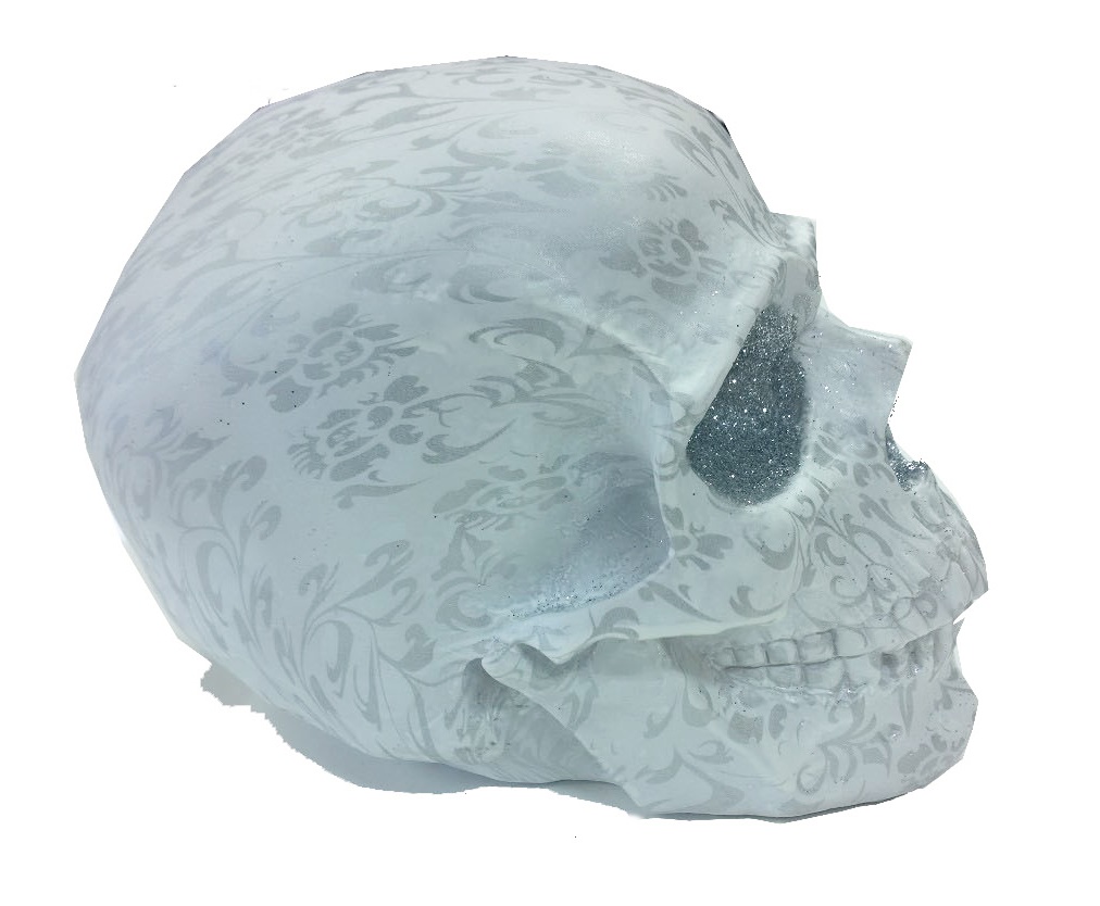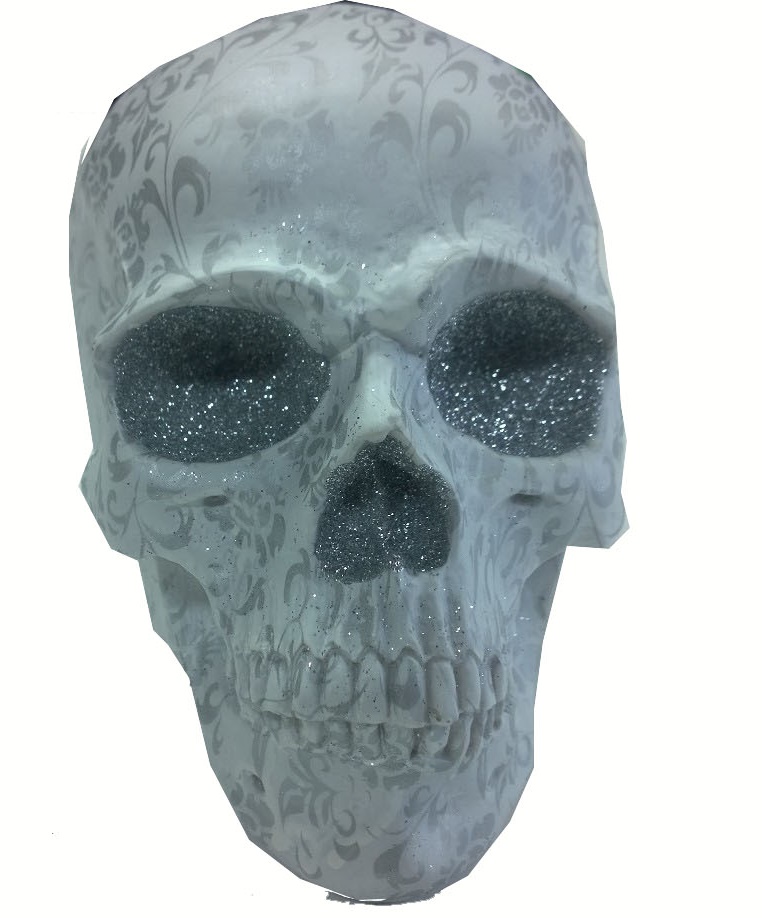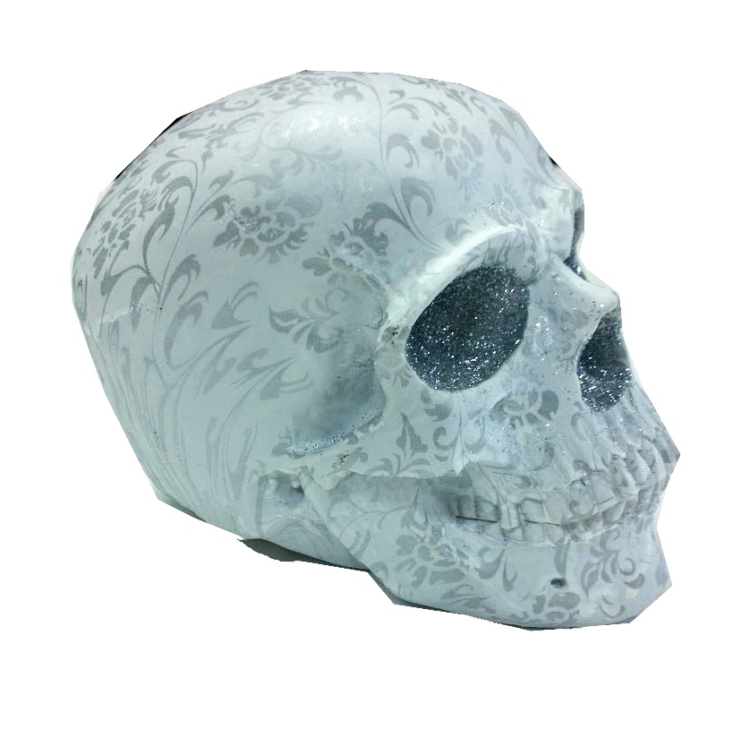 Koriste Pääkallo tuo moderniin kotiin näyttävän ja persoonallisen lisän, joka herättää kiinnostusta ja korostaa tilan tyyliä. Sen hienostunut valkoinen pohja yhdistettynä harmaaseen ornamenttikuviointiin luo ajattoman ja elegantin kokonaisuuden, joka sopii niin minimalistiseen kuin runsaampaankin sisustukseen.