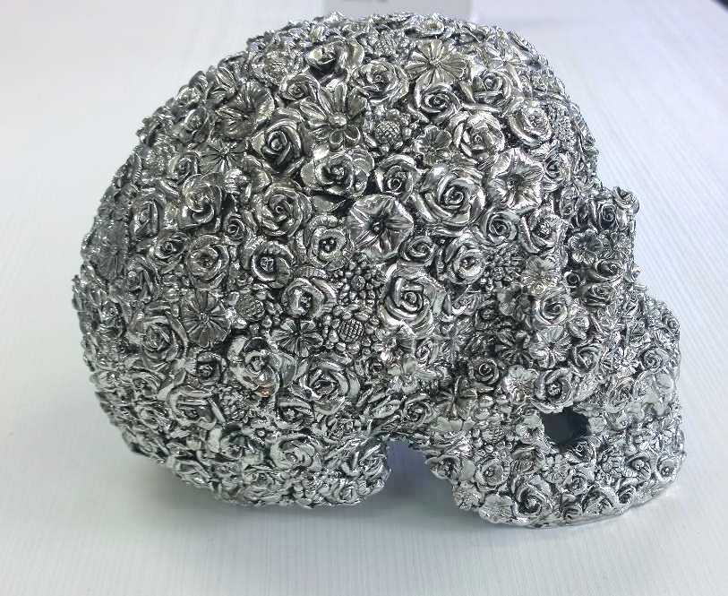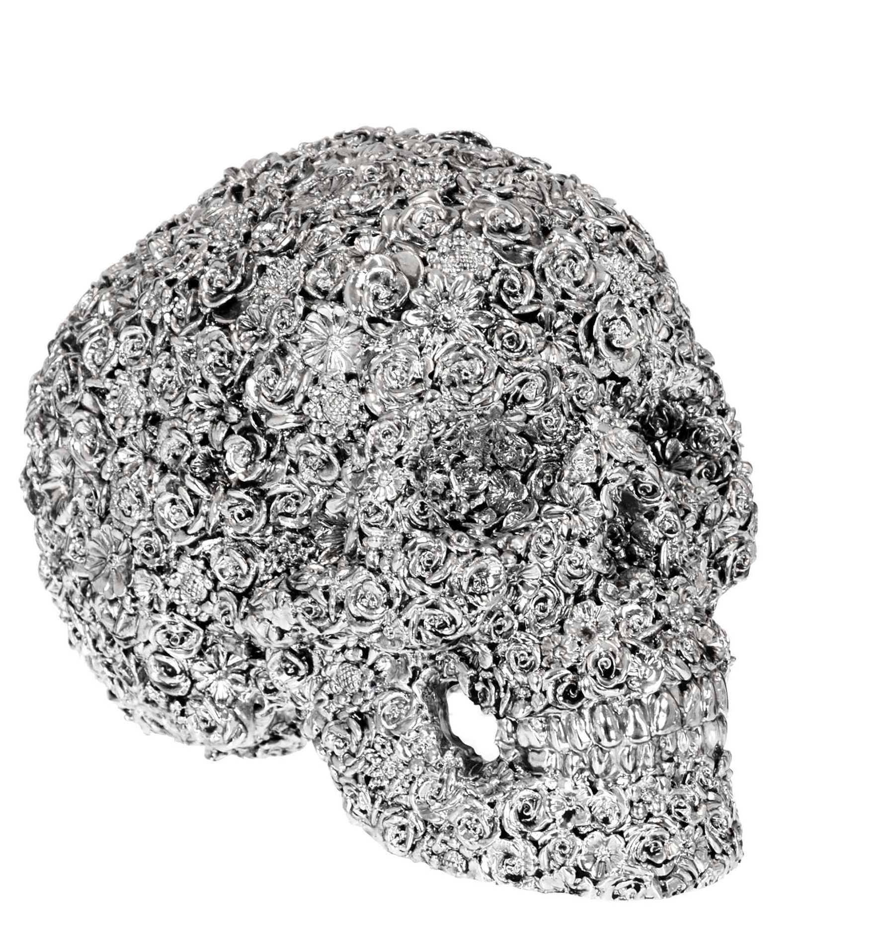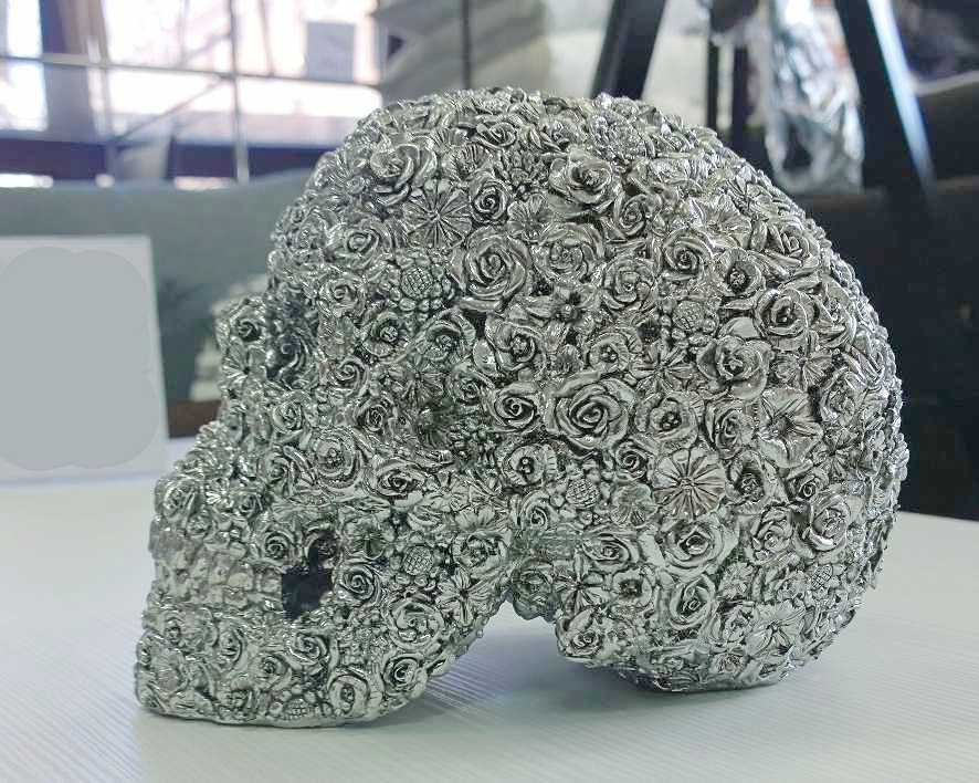 Koriste Pääkallo – Ruusu yhdistää hopeisen kiillon, ainutlaatuisen ruusuyksityiskohdan ja monikäyttöisen rakenteen rohkeaksi ja tyylikkääksi sisustuksen katseenvangitsijaksi.