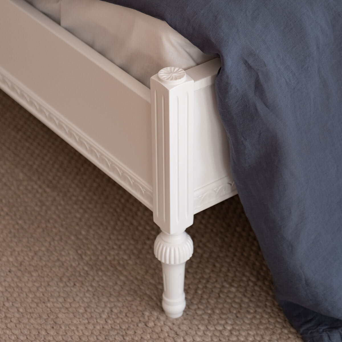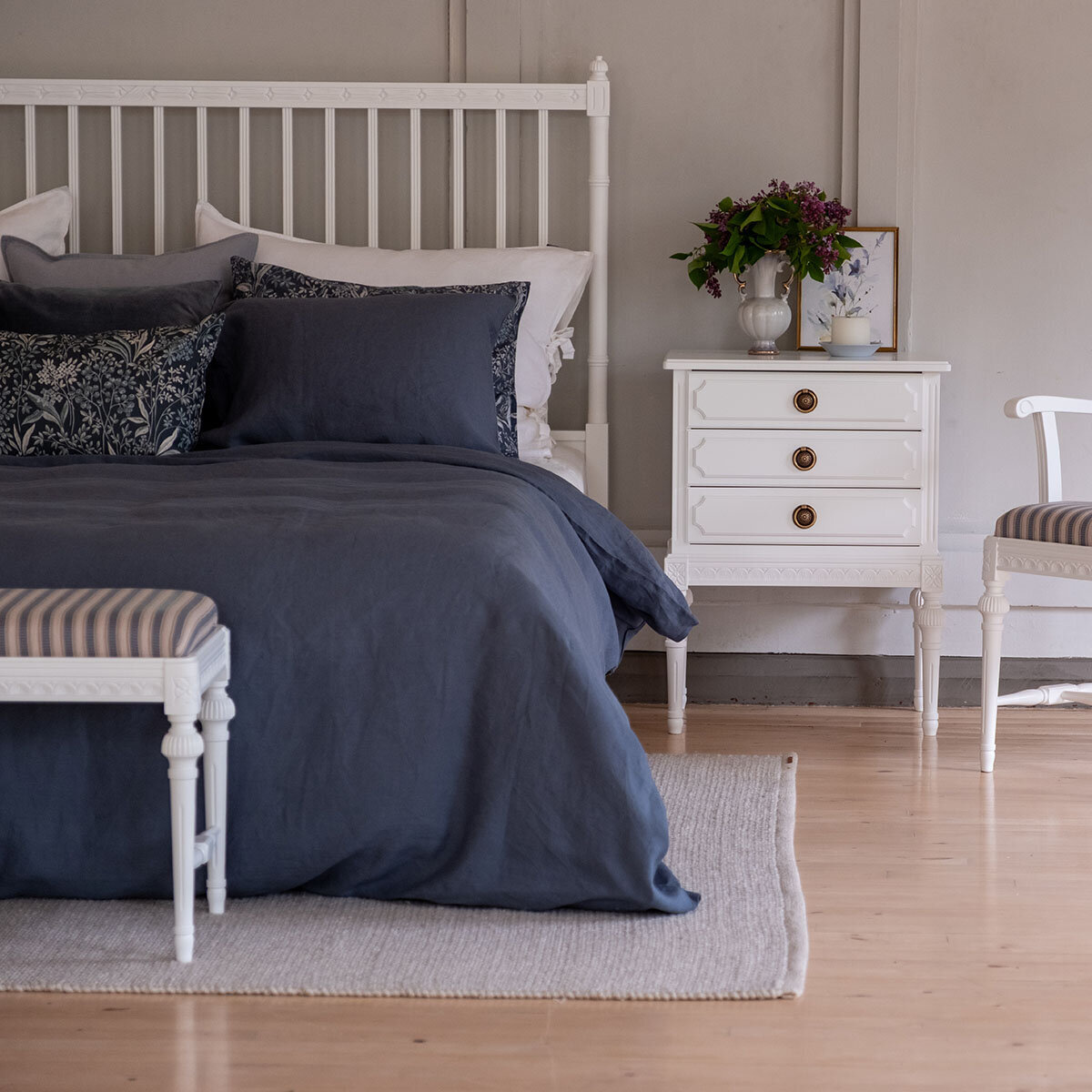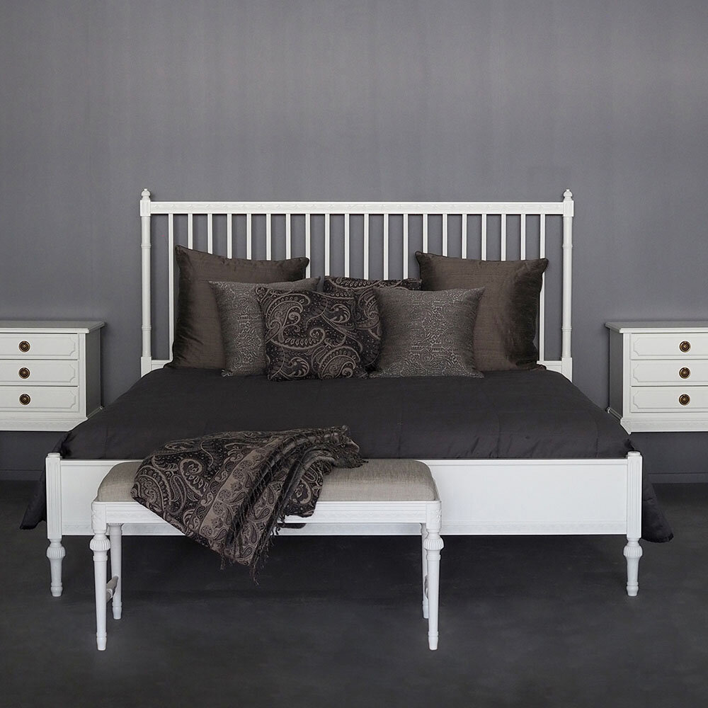 Kustavilaistyylinen divaanisänky hurmaa selkeillä linjoillaan ja hillityllä eleganssillaan. Vaaleat sävyt, kuten perinteinen helmenharmaa, tuovat tilaan valoisuutta ja raikkautta – ja halutessasi voit valita myös muita värivaihtoehtoja. Käsin tehty kullan- tai harmaanvärinen patinointi viimeistelee kokonaisuuden ja antaa sängylle arvokkaan, yksilöllisen ilmeen.