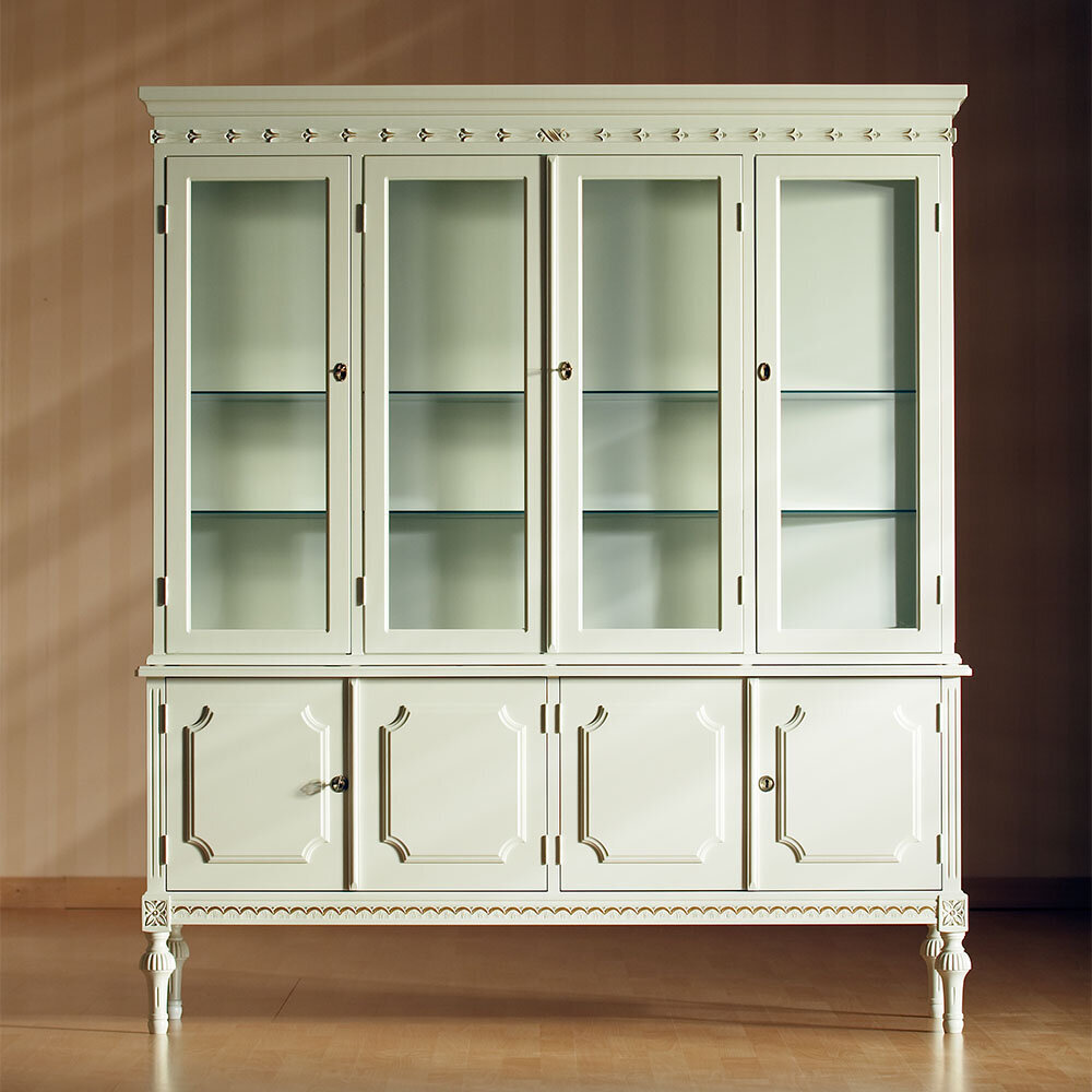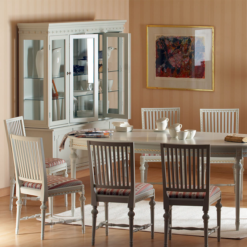 Kustavilaistyylin tunnusmerkkejä ovat suorat linjat, hillitty ornamentiikka ja vaaleat, helmenharmaat sävyt. Halutessasi kaapin saa myös muissa värivaihtoehdoissa, ja viimeistelyyn voit valita käsin maalatun kullan- tai harmaanvärisen patinoinnin, joka antaa kalusteelle yksilöllisen ja arvokkaan ilmeen.