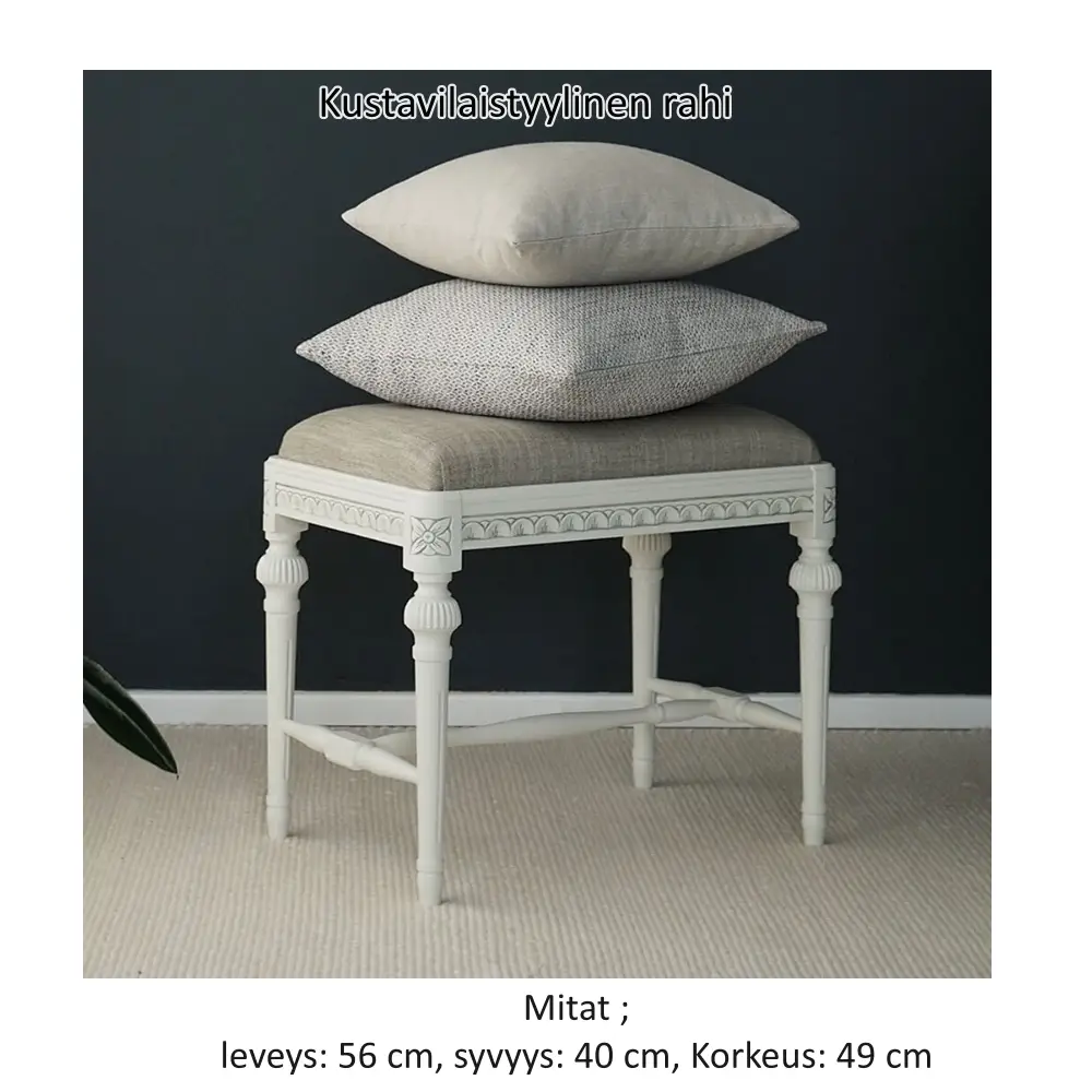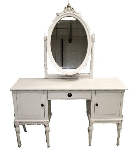 Tämä kotimainen Kustavilainen kampauspöytä yhdistää ajattoman tyylin ja käytännöllisyyden. Pöydässä on kaksi kaappia, keskellä yksi laatikko ja mukana peili, joka viimeistelee elegantin kokonaisuuden. Lisätarvikkeena saatavissa rahi, joka tuo mukavuutta ja täydentää kampauspöydän käyttöä.