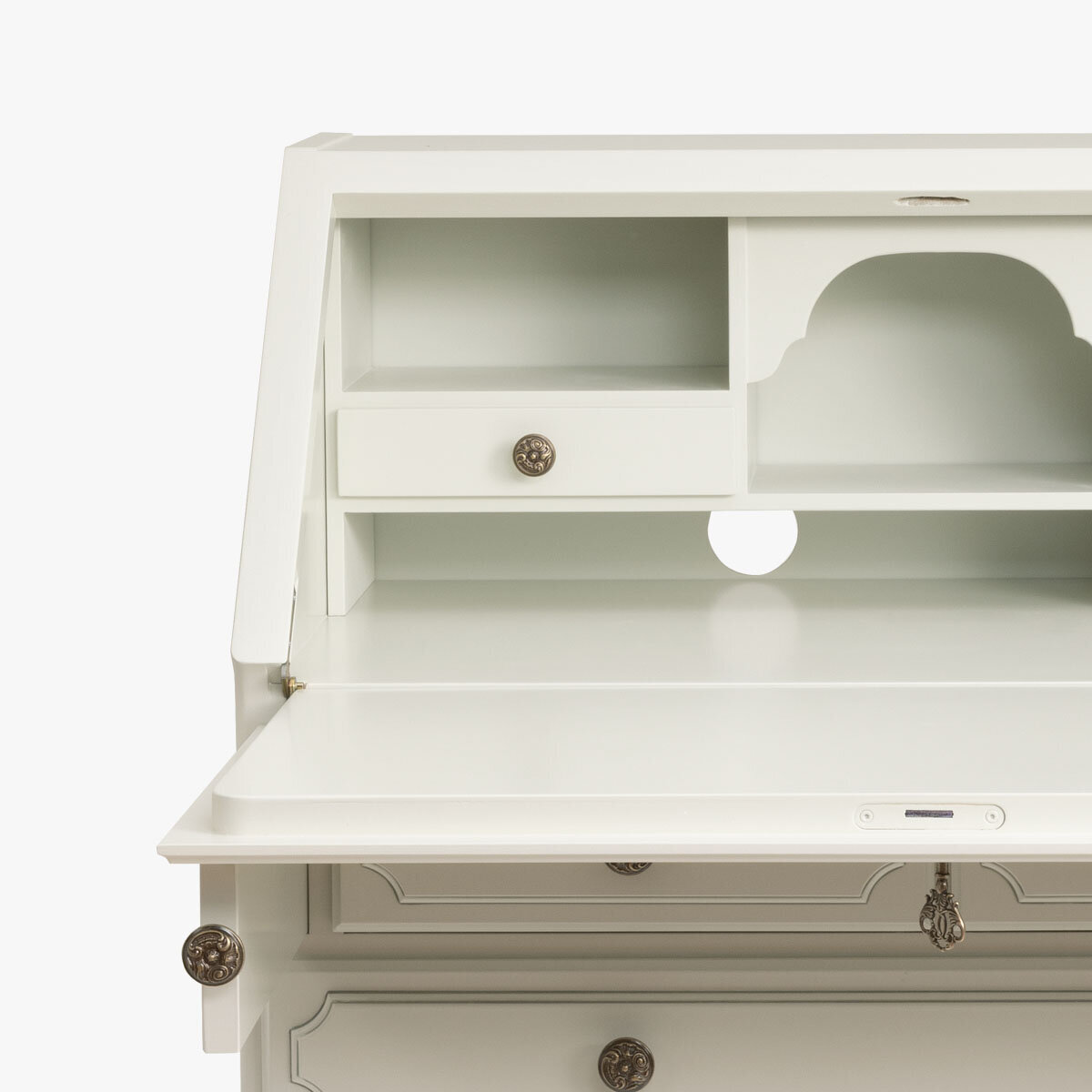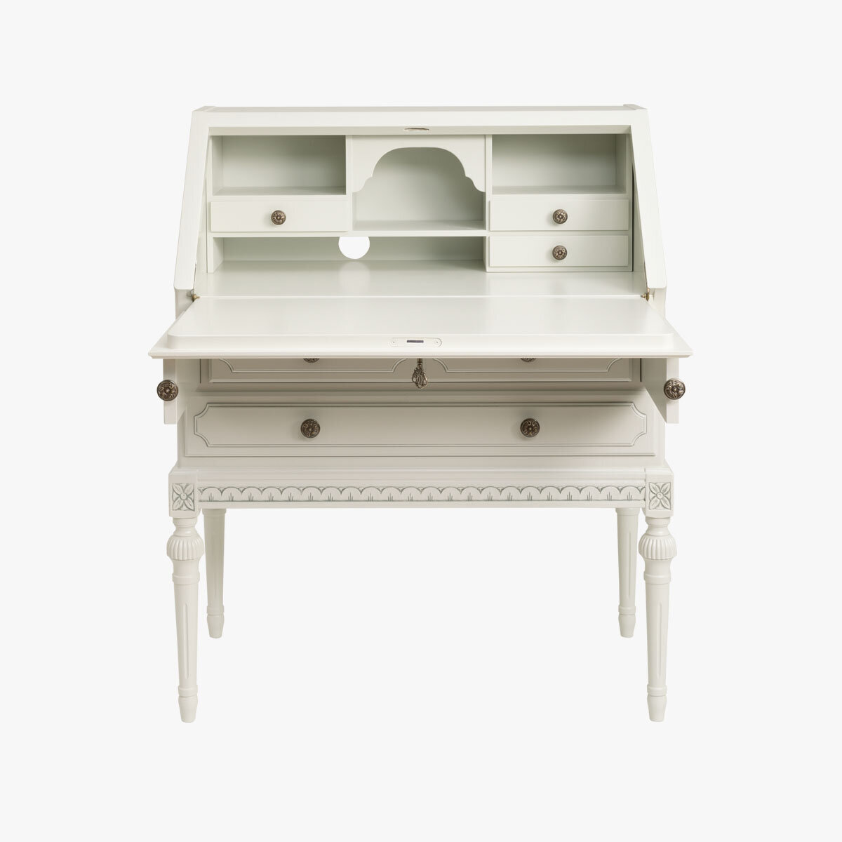 Tämä kotimainen Kustavilainen klaffilipasto yhdistää klassisen tyylin ja fiksun säilytysratkaisun. Klaffioven takaa paljastuu pieni työpiste, jossa on kolme pientä laatikkoa ja hyllylevyt, myös kannettavalle tietokoneelle – täydellinen satunnaiseen tai lyhytaikaiseen työskentelyyn. Lipaston alaosassa on kolme isompaa laatikkoa, jotka tarjoavat runsaasti säilytystilaa paperille, kansioille ja muille tarvikkeille.
