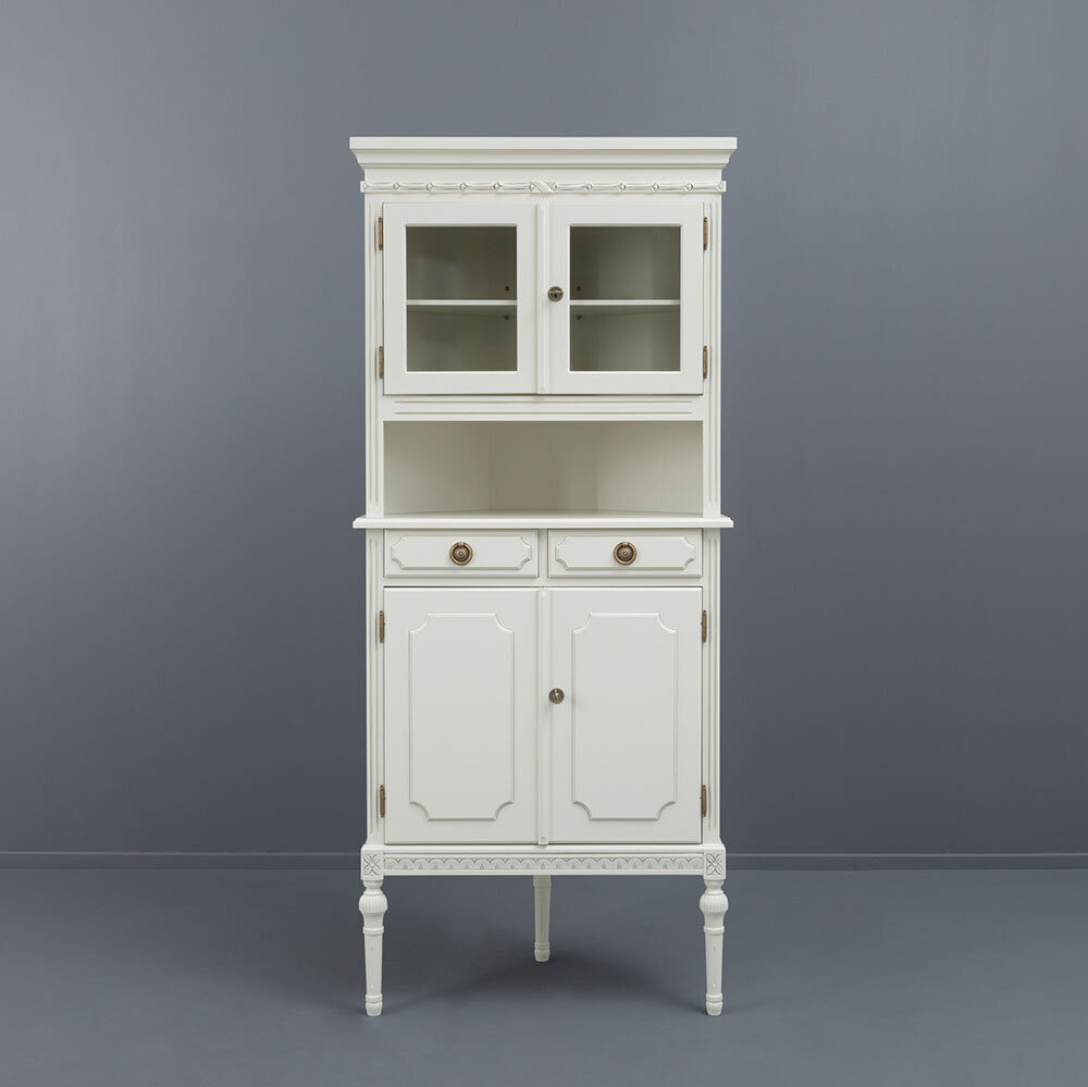 Tämä näyttävä kustavilaistyylinen nurkkakaappi hyödyntää tilan tehokkaasti ja tuo kotiisi arvokkuutta. Alaosassa on kaappi, sen päällä kaksi laatikkoa ja avohylly, sekä kaapin yläosassa vitriini kahdella hyllyllä – täydellinen yhdistelmä käytännöllisyyttä ja eleganssia.