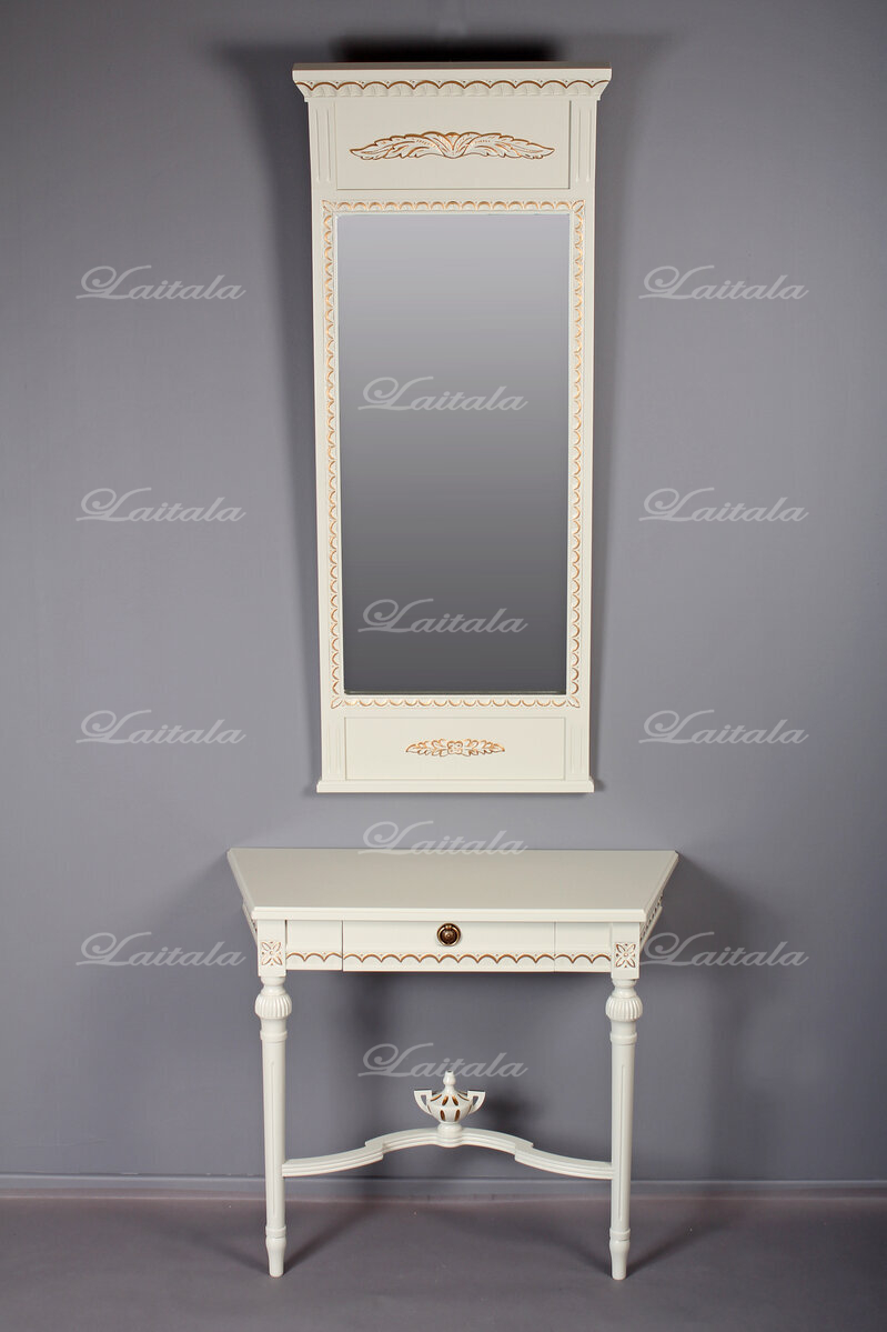 Kotimainen Kustavilainen 2-jalkainen peilipöytä on tyylikäs ja sirorakenteinen kaluste, joka sopii makuuhuoneeseen, eteiseen tai olohuoneeseen. Saatavana useissa väreissä sekä käsin maalatulla kulta- tai harmaapatinoinnilla – toimitetaan valmiiksi koottuna.