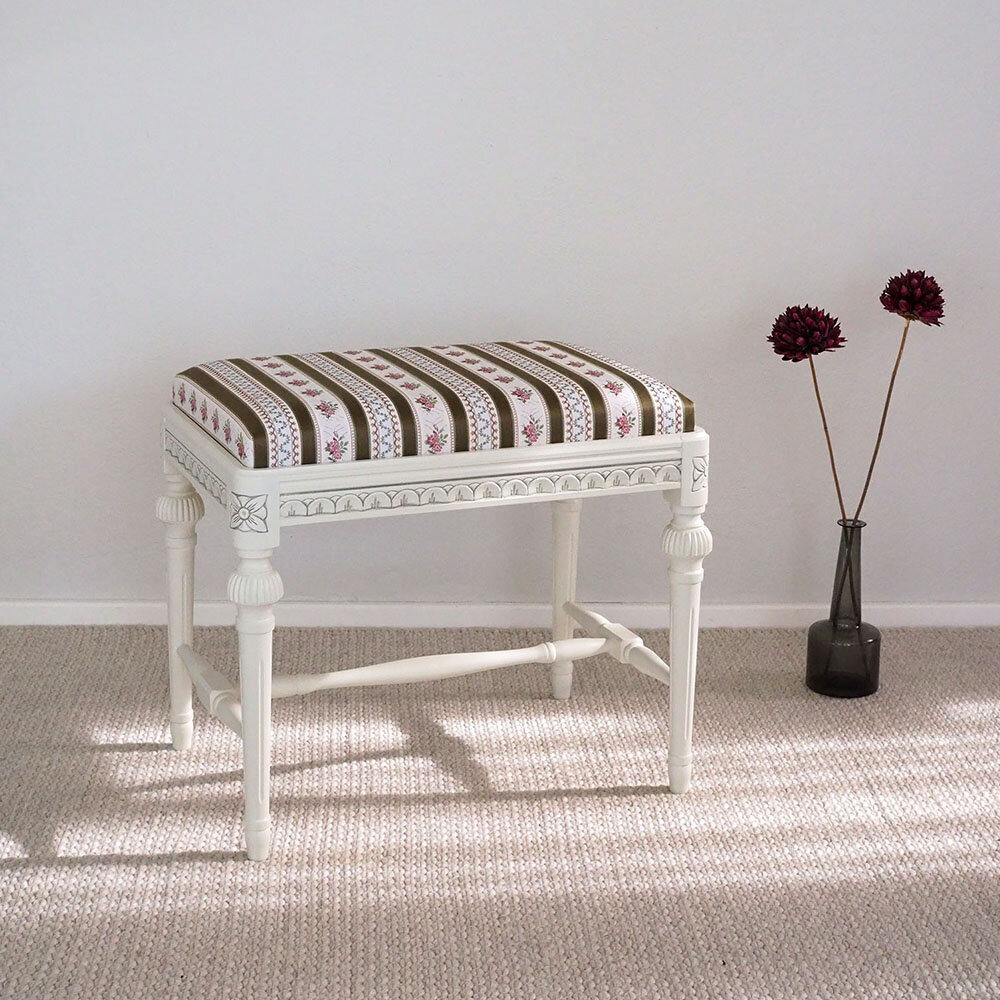 Kotimainen Kustavilainen rahi täydentää tyylikkäästi olohuoneen tai makuuhuoneen sisustusta ja toimii sekä istuimena, jalkarahina että kauniina sisustuselementtinä. Suomessa käsityönä valmistettu rahi on saatavana useissa eri väreissä ja verhoiluissa, ja sen ilmettä voi viimeistellä käsin maalatulla kullan- tai harmaanvärisellä patinoinnilla.